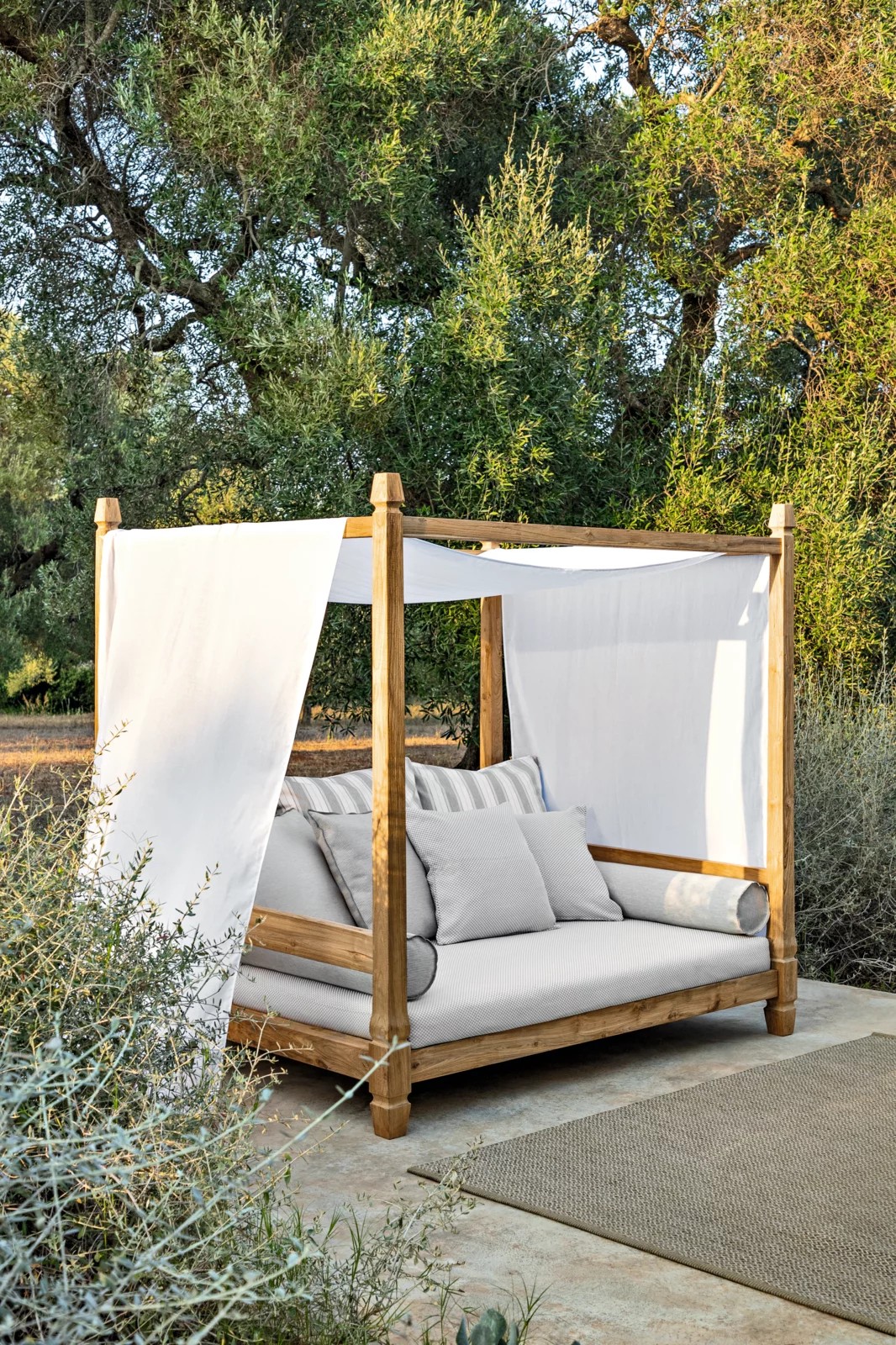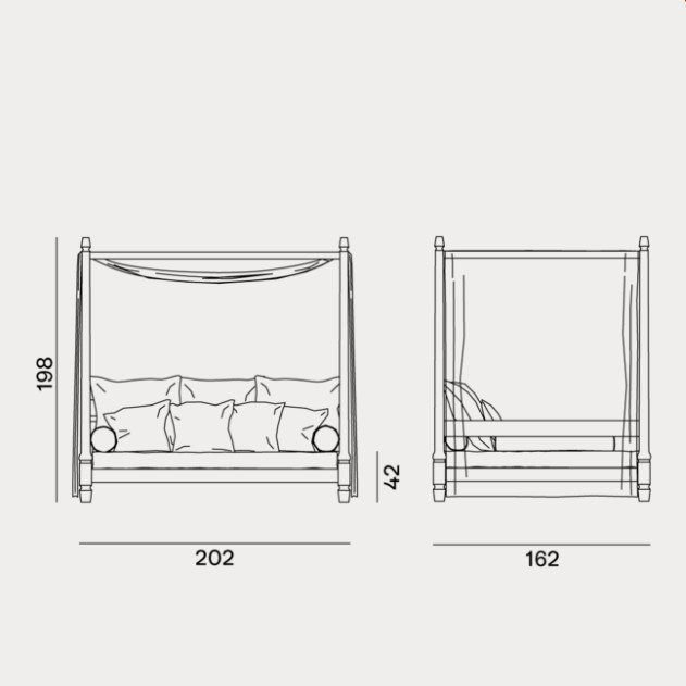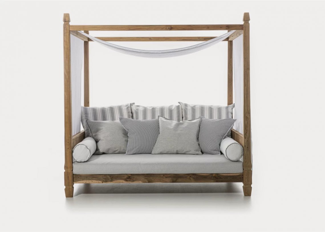Divano a baldacchino in stile coloniale di ispirazione esotica, Jeko 07 ha una struttura realizzata in ECOTeak, materiale proveniente dal riutilizzo di travi ed elementi in teak recuperati, riparati con legno riciclato, assemblati e levigati per evidenziare le venature originali. è caratterizzato da una seduta ampia e bassa, con cuscino sfoderabile a cui si possono aggiungere cuscini volanti per aumentarne il comfort. Dai quattro angoli del divano partono 4 colonnine in legno che vanno a costruire il baldacchino, sul quale è adagiata una tenda bianca per una maggiore privacy ed intimità.