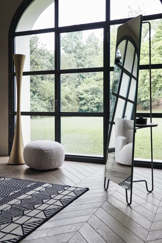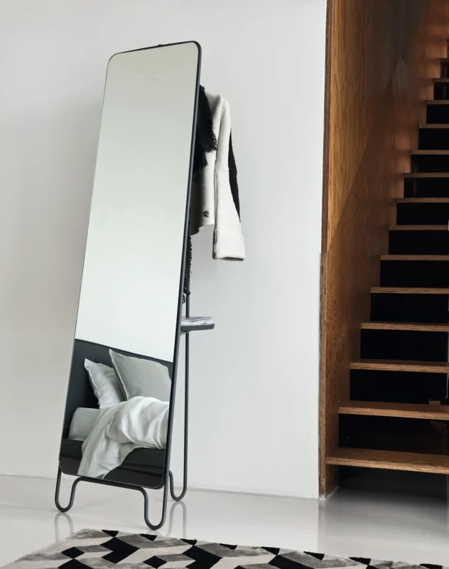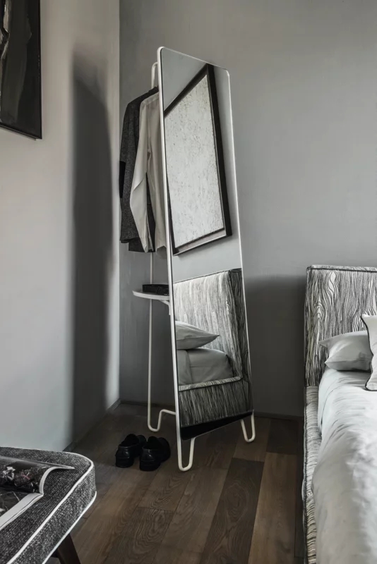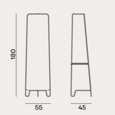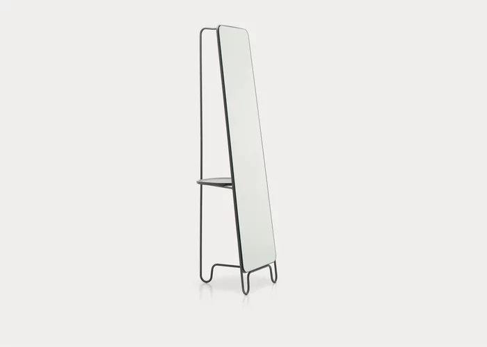 LC 198 è uno specchio a terra di forma rettangolare, con una struttura in tondino d’acciaio verniciato bianco o grigio finitura opaca. La struttura in acciaio si curva nei piedini creando un prodotto dalle forme sinuose e ingloba un ripiano in noce canaletto naturale, nero, bianco, grigio, oceano o tortora per aumentarne la funzionalità.