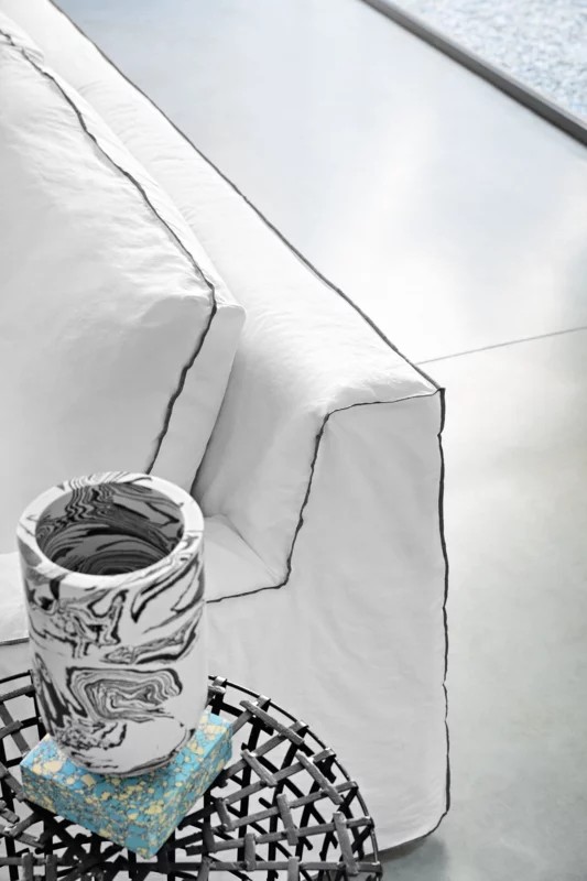 La struttura in legno massello con scocca in poliuretano espanso si unisce ad ampi cuscini di seduta e di schiena realizzati con un soffice strato di piuma d'oca canalizzata, con il recupero della tecnica tradizionale dell'uso di molle insacchettate nei cuscini seduta, per un comfort accentuato. In tutte le sue versioni, la collezione LOLL è completamente e facilmente sfoderabile.