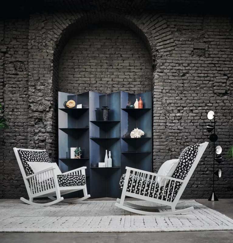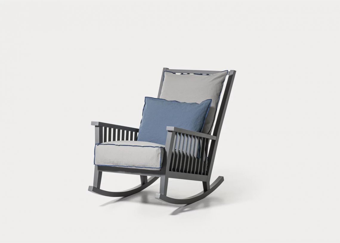 Sedia a dondolo in legno, Gray 09 è contraddistinta da un alto schienale con doghe a vista su cui è appoggiato un morbido cuscino volante. La struttura, con ampia e accogliente seduta, è realizzata in noce Canaletto verniciato naturale, rovere sbiancato o rovere laccato bianco, grigio, nero, oceano o tortora.
