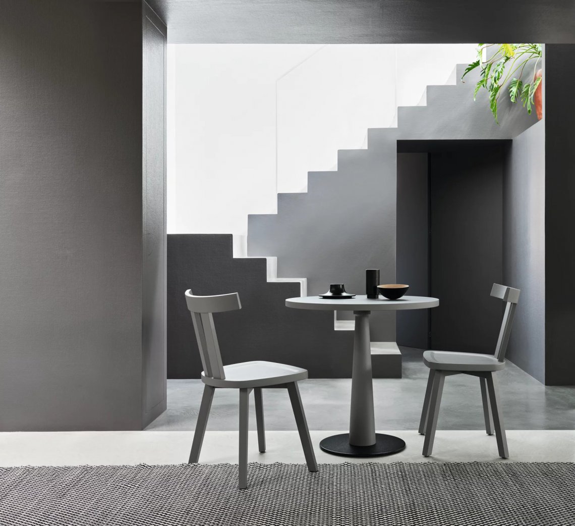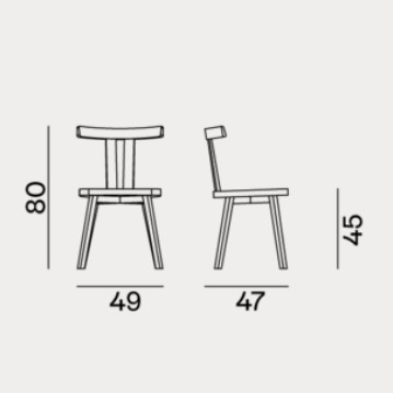 La sedia Gray 23 è definita da un particolare e minimale schienale: tre grandi listelli in legno, due verticali e uno superiore orizzontale, che abbracciano la seduta. La struttura è realizzata in noce Canaletto verniciato naturale, rovere sbiancato o rovere laccato bianco, grigio, nero, oceano o tortora, alla quale può essere aggiunto un cuscino di seduta opzionale per una maggiore morbidezza.