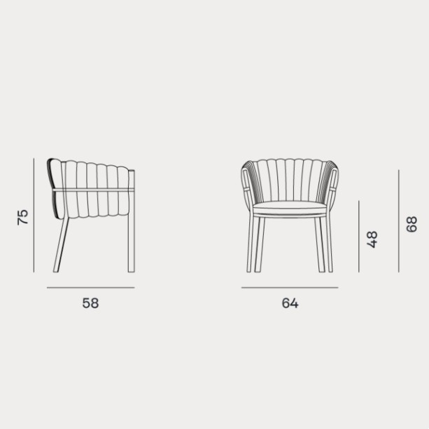 Sedia con struttura in frassino laccato nei colori bianco, grigio, nero, oceano, tortora, Date, Blueberry o Ginger. Seduta in poliuretano su telaio in legno multistrato cinghiato e rivestimento sfoderabile in tessuto trapuntato. Disponibile in tutti i tessuti di campionario eccetto 3D, Quilt Malta e Quilt Velour.