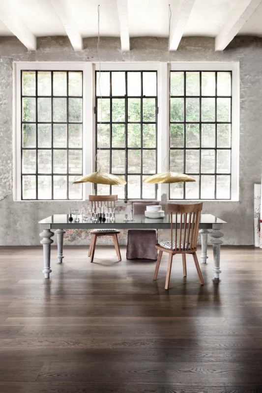 Animo vintage e design contemporaneo caratterizzano la famiglia di tavoli Gray 32/33/34/35. Disponibili in diverse dimensioni con piano quadrato o rettangolare, uniscono materiali diversi che si combinano per dare vita a molteplici combinazioni. Al piano a doghe impiallacciate di noce o rovere, marmo bianco Carrara o lamiera di ferro cerata, si uniscono quattro gambe in noce o rovere, in porcellana bianca, marmo bianco Carrara o in fusione di alluminio lucidato, con elegante tripla tornitura. Finiture legno disponibili: noce Canaletto verniciato naturale, rovere sbiancato o rovere laccato bianco, grigio, nero, oceano o tortora.
