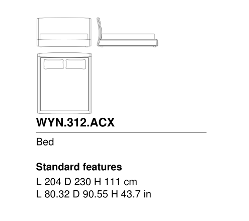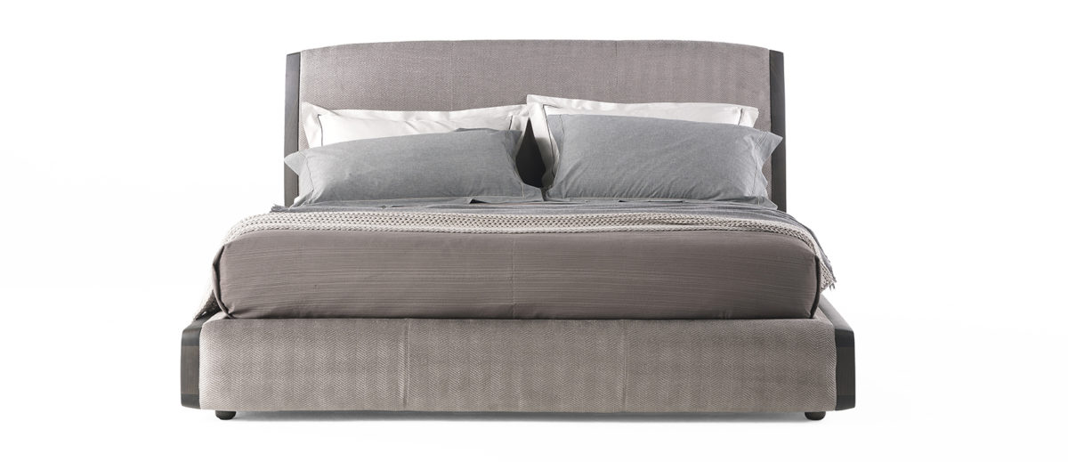 Bed frame panels in curved multilayer wood covered in dacron and in cat. A Woven fabric 20.01 Chevron Gray. Solid beech wood dyed Smokey Gray shaped with variable section, irregular curves and finger joints with CNC technology, installed onto a panel with retractable pins. Lateral storage compartments entirely covered in cat. A Woven fabric 20.01 Chevron Gray.