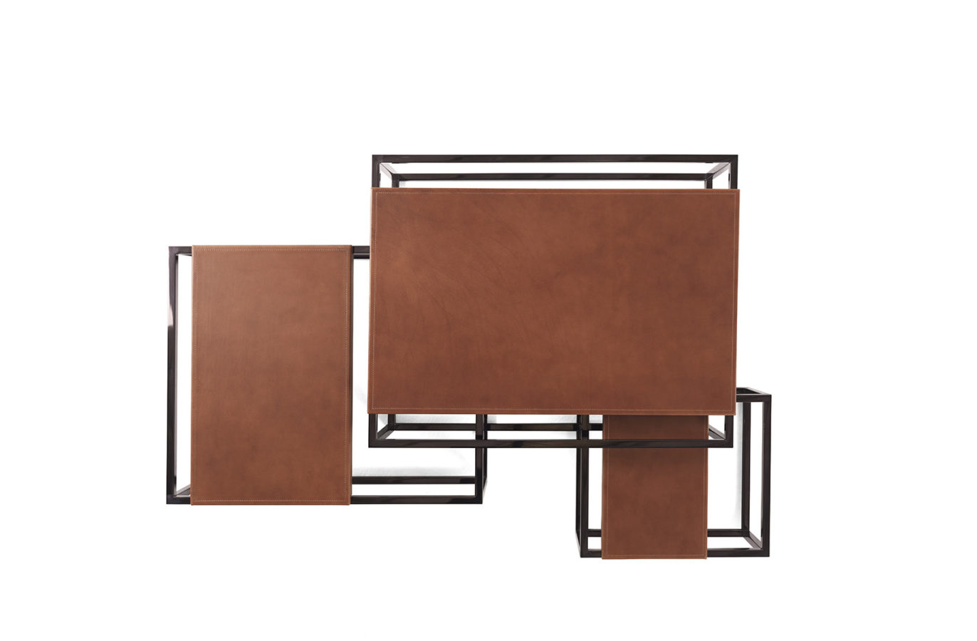 Moveable table tops in MDF, contoured with CNC technology, covered in L.09.02 cat. C Natural Saddle leather, with visible tone on tone stitching in nylon thread.