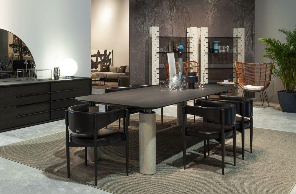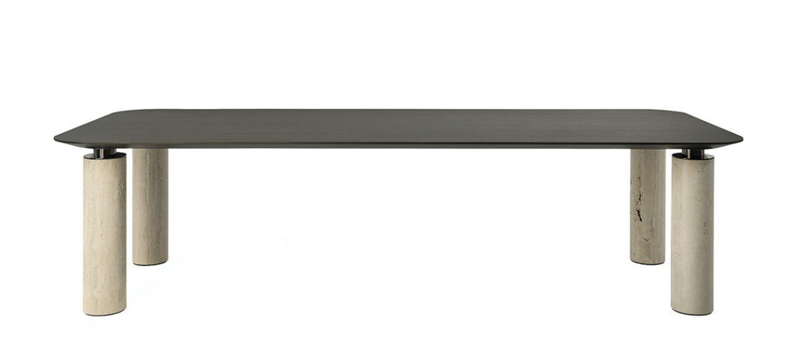 Rockefeller is an elegant dining table with a contemporary aesthetic. Its sculptural design is characterized by the contrast between solidity and lightness, stability and dynamism and light and dark shades. The robust appearance given by the thickness of the legs is counterbalanced by the delicacy and elegance of Travertino marble. The top with smoky grey finish - in contrast with the delicate tone of the legs - has a rounded shape, to give a sense of softness to the whole.