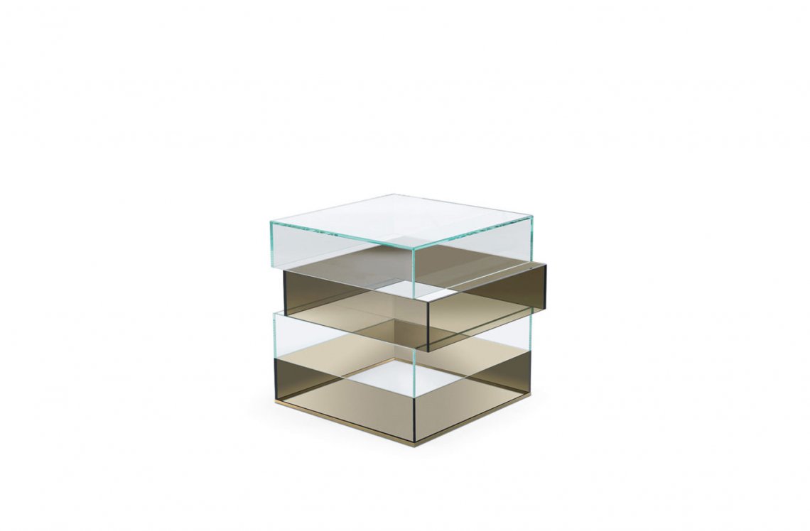 Pure volumes and essential lines: these are the main features of the Jenga low table. A composition with a refined design that is expressed in the succession of light and dark glass rectangles, assembled at 45° and joined without showing grafts or joints. The entire structure is made of glass and the whole piece is revealed to the eye as a unique light and refined block.