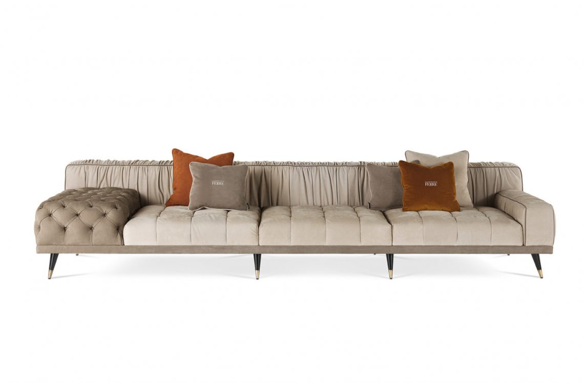 A sofa with a bold personality that combines essential design, contemporary lines and a high level of craftsmanship. The alternation between different finishings, with capitonné parts and pleating on the back creates a unique and refined set that expresses the sartorial skills of the brand.