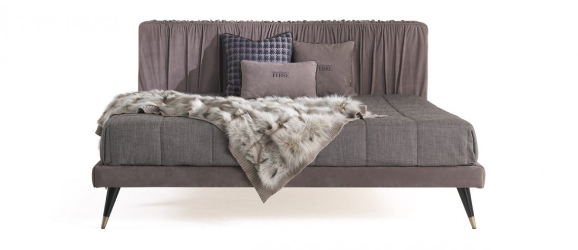The refined pleating of the headboard, an element that denotes the sartorial skill of the Gianfranco Ferré Home brand, is the distinctive element of the Highlander bed, enriched with feet with bronzed wood ferrules.