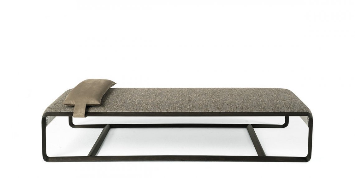Daybed with structure in solid beech wood dyed Smokey Grey, shaped in variable section, with irregular curves and finger joints, joined to the seat with concealed pins.
