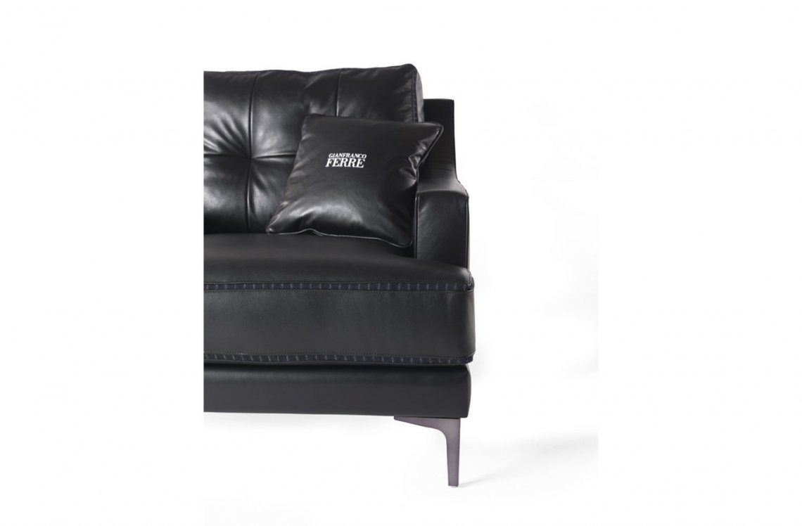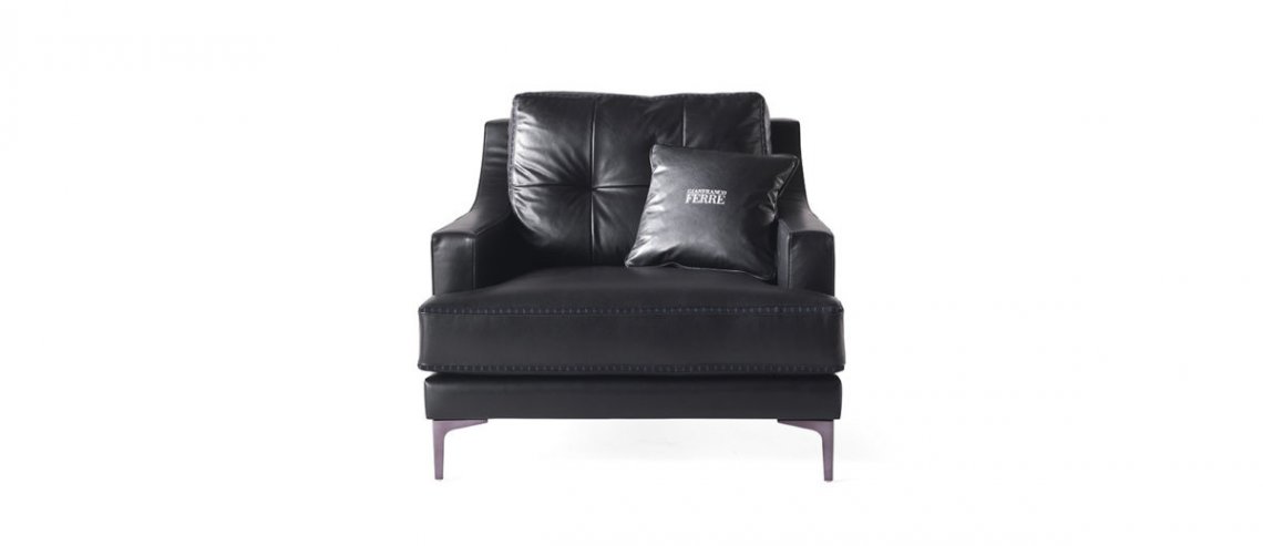 An armchair with an urban charm and a bold character, which combines the elegance of leather with details in pinstriped fabric, in a typical Gianfranco Ferré Home style. The feet in metal with black chrome finishing confirm the metropolitan style and urban taste of the 2019 collection.