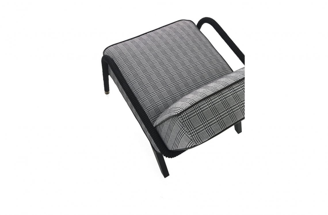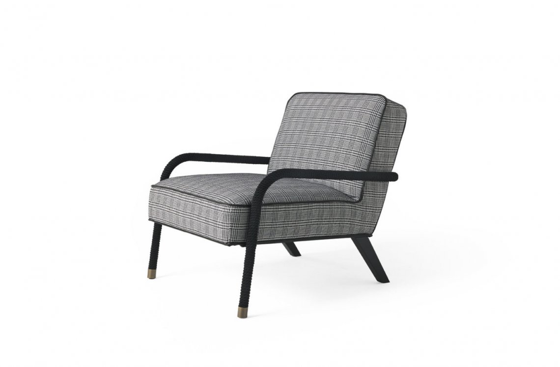 Linear and essential shapes for an armchair in Gianfranco Ferré Home style. Loop is inspired by the 50s style. The rope is the element that enriches the armchair covering the structure and becoming leg and armrest. Other featuring elements are the brass caps of the legs and the fabrics with geometric motifs and soft colors.