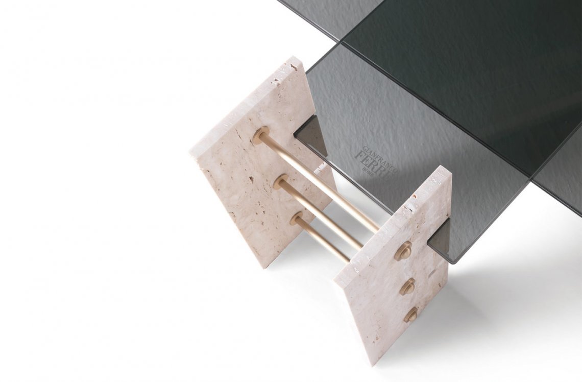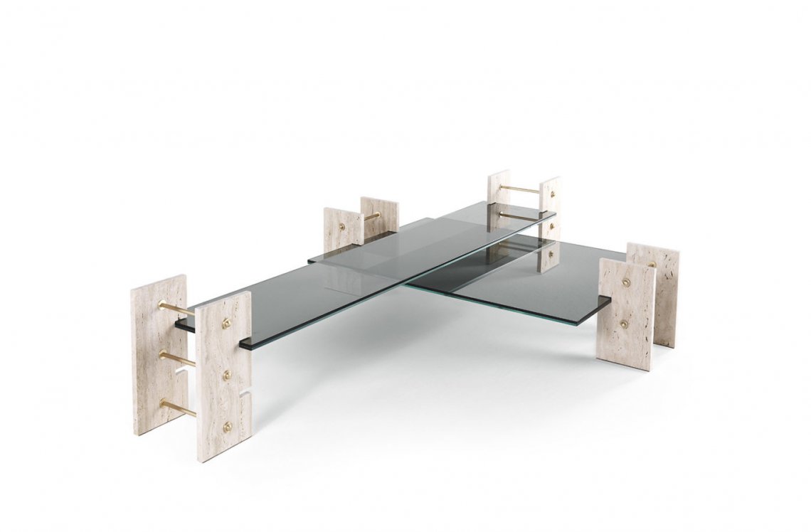 The Fitzroy line epitomises the industrial style which runs throughout the collection. These pieces, with a 1970s feel, recall the shape of the mechanical devices and are made of travertine marble, brass and smoked glass.