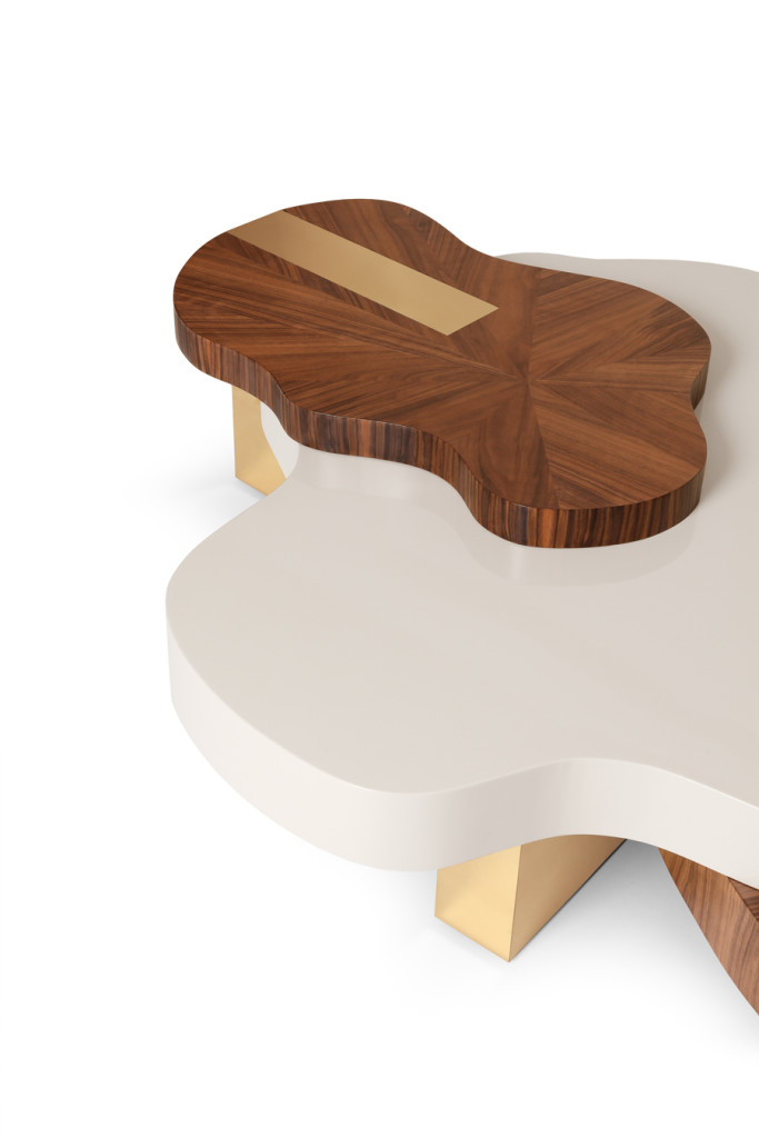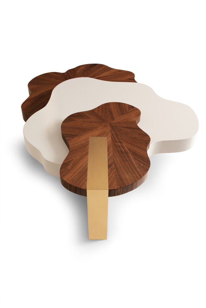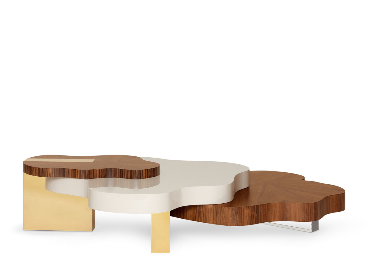 The Nenuphar gently floats on the surface with different cascading tops that create a charming chromatic effect. The brass and crystal acrylic feet maintain the floating illusion, while providing a playful contrast with the inlay marquetry technique and lacquered top.