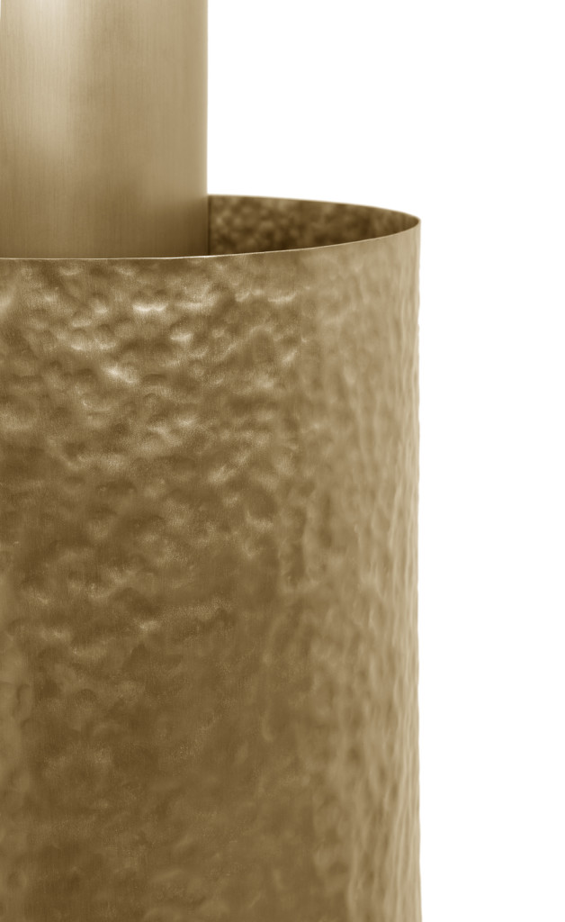 Projecting dramatic and warm light, the Bond Wall Lamp is an elegant and strong piece, with an exterior arc in polished hammered metal that enlaces the interior arc in brushed plain metal.