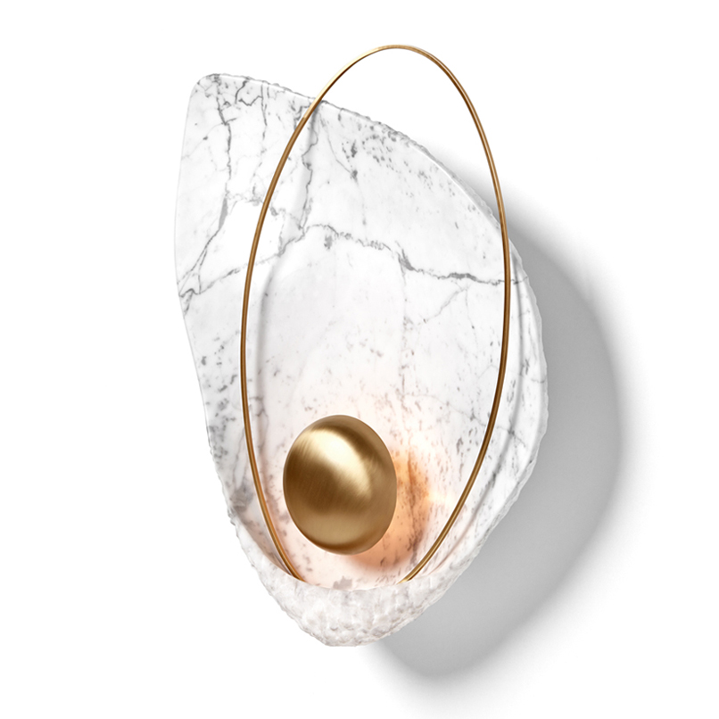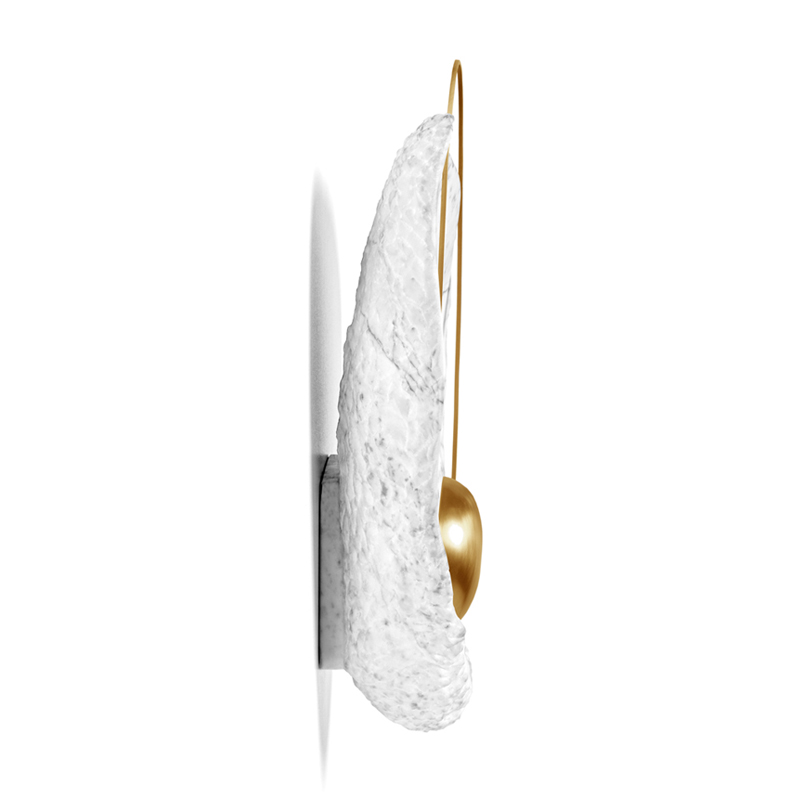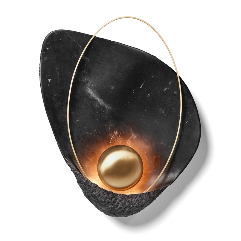 The Pearl Wall Lamp is a poetic handcrafted tribute to Nature’s mysterious ways. The piece, made in marble and metal, represents one of its quintessential attributes – serendipity. The magnificence of pearls, when produced naturally by oysters, is as breathtaking and it is exquisitely rare. The Pearl Wall Lamp’s marble shape is carved by hand, making each piece, much like a natural pearl, an absolutely unique sculpture.