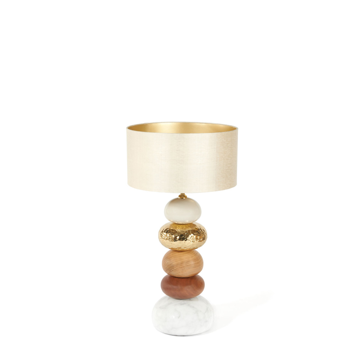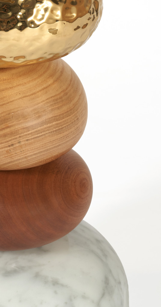 Pebbles found by the water, on a beach, on a lake or a pond, have a calming and soothing feel, evoked by the Pebble Lamp. This sculptural piece is handmade with a combination of natural materials such as marble, exotic wood and hammered metal.