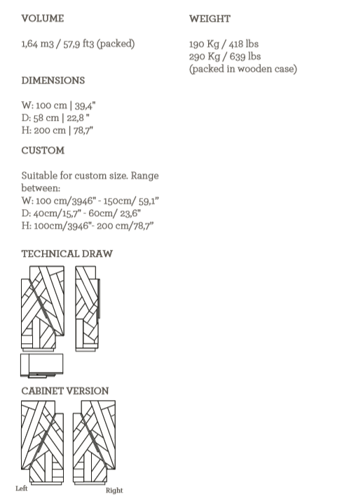 The Meridiano Bar Cabinet is a contemplation on the polarities in Nature. North and south, earth and water, gravity and air, these poles coexist with seemingly impossible harmony. Intricate in design and standing in purposeful equilibrium, the Meridiano emanates magnetic character. The wood marquetry is the framing device for two large doors, with an interior designed and made to hold glasses and bottles.