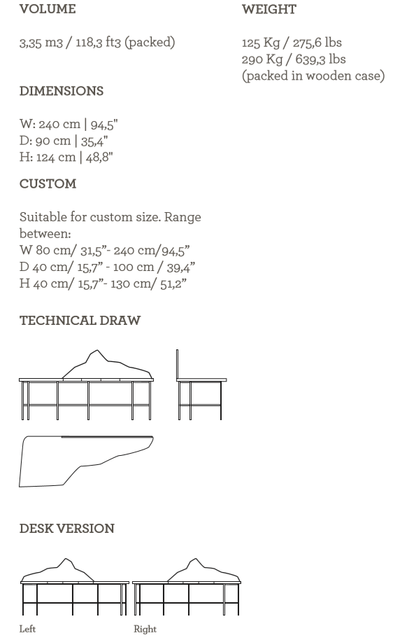 The distinctive Landscape Desk initiates a design tension between rough and smooth, straight lines and faceted shapes. It’s novel metal structure is the foundation from where mountains and hills arise, reimagined in its silhouette. The desk devises a panoramic setting that can be appreciated from any vantage point.