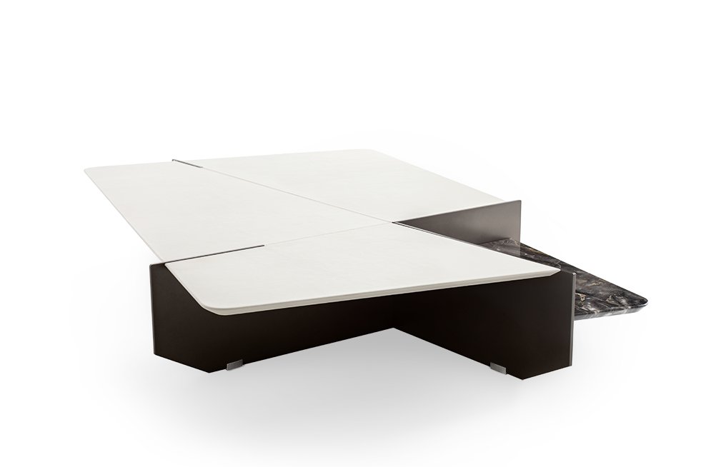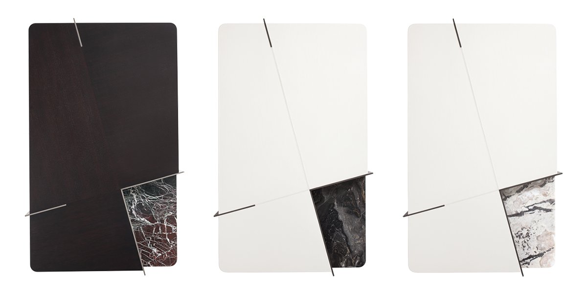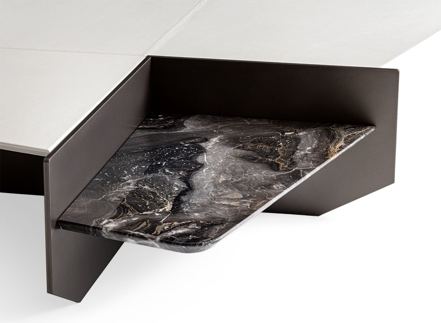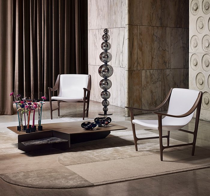 Skillful combination of materials, finishes, and perspectives for a geometry that unfolds on two levels, creating three-dimensional effects.