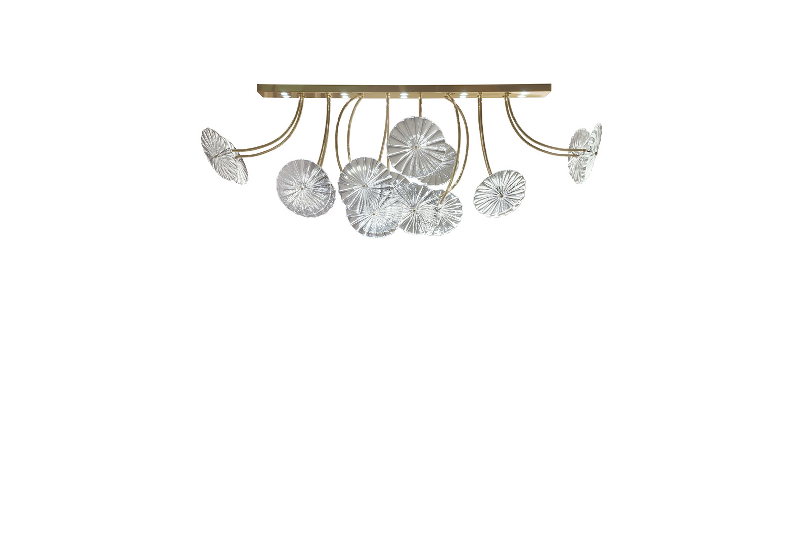 Light gold chrome stainless steel base with 16 lights. Composed of 16 Venetian “Murano" clear blown glass.