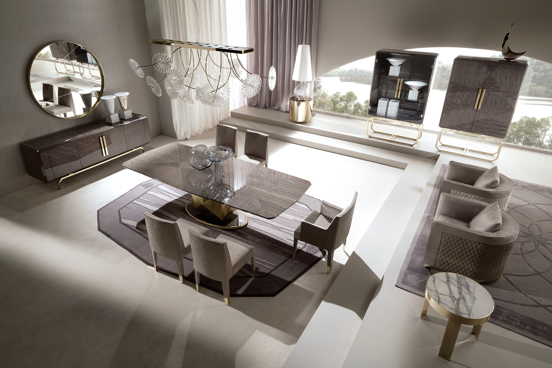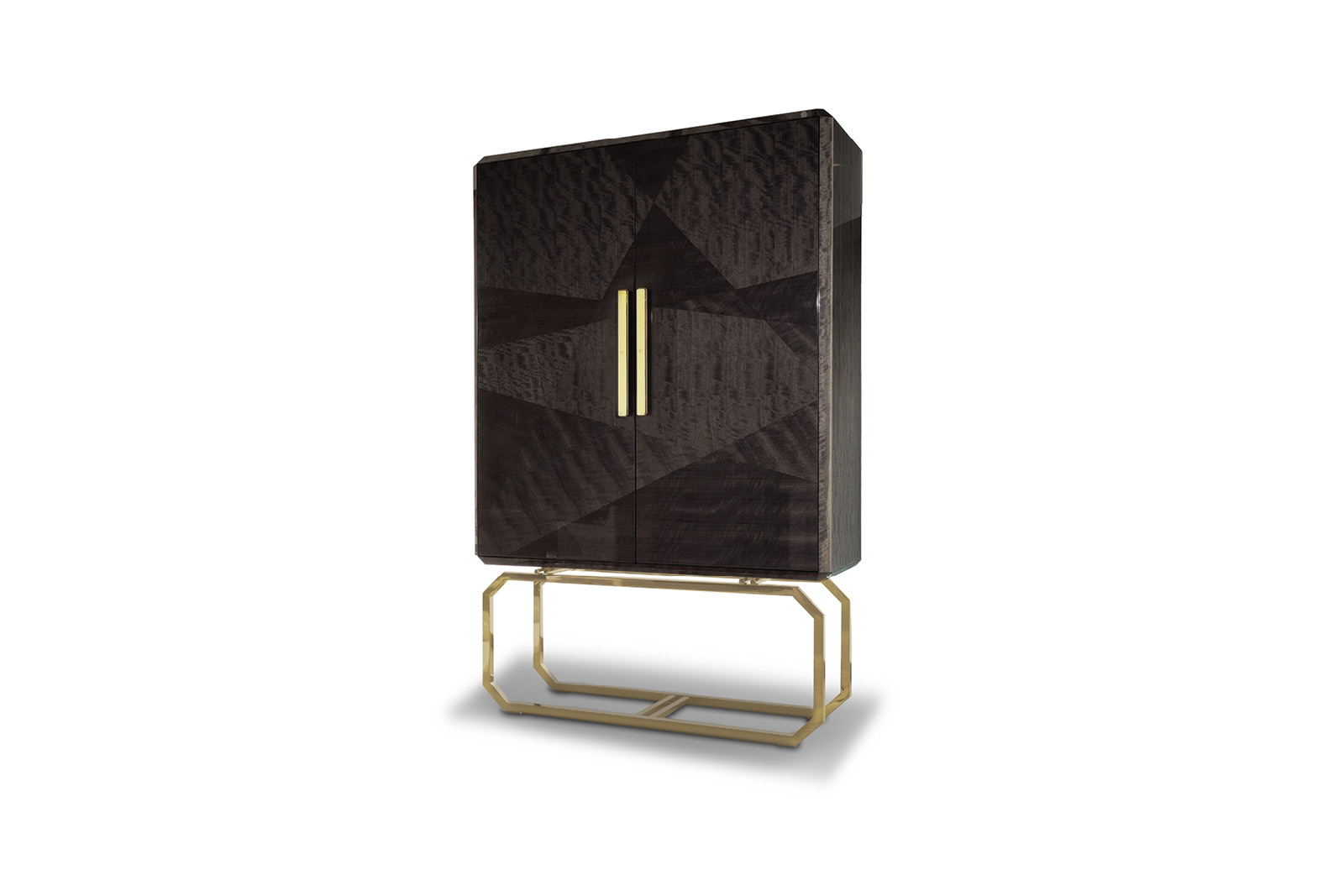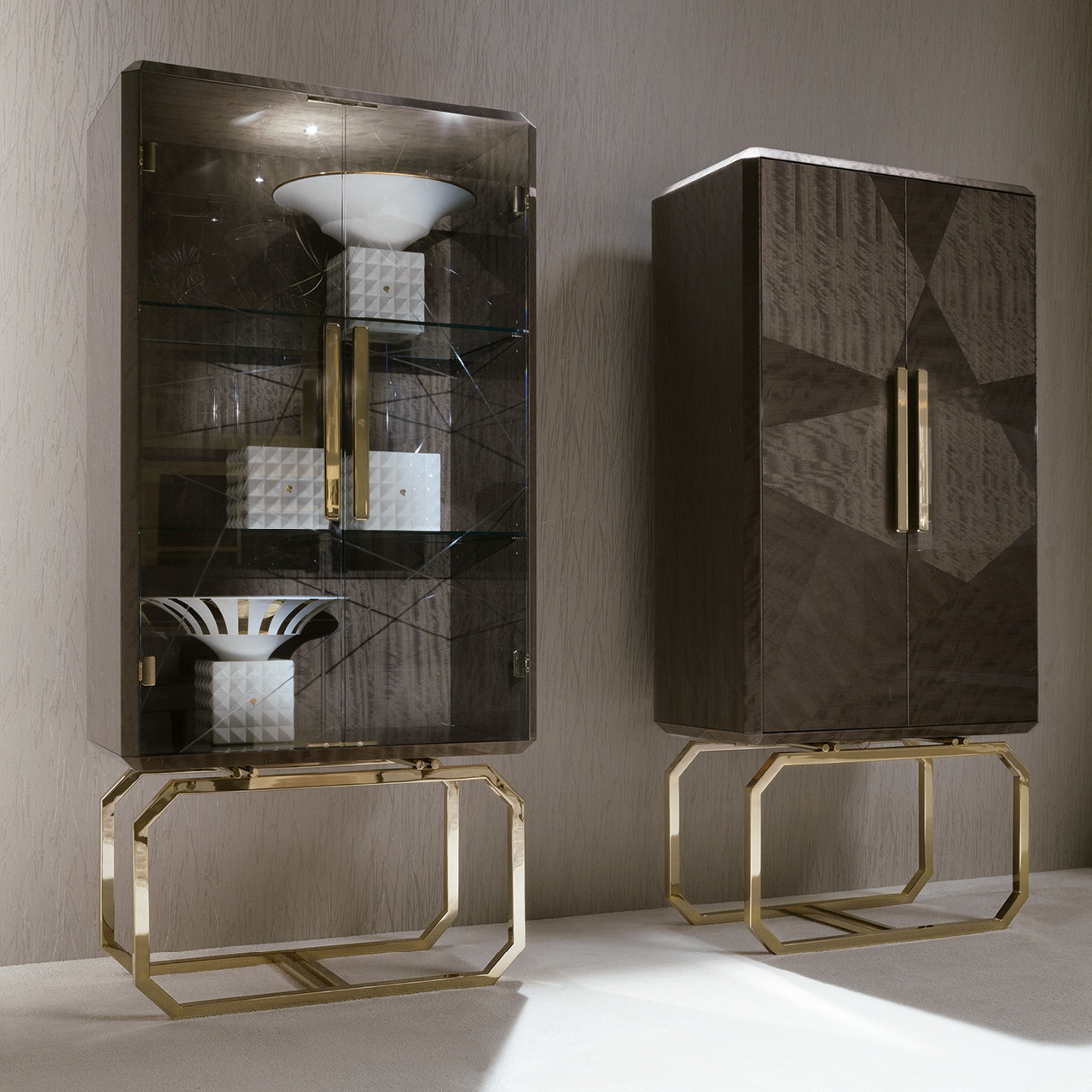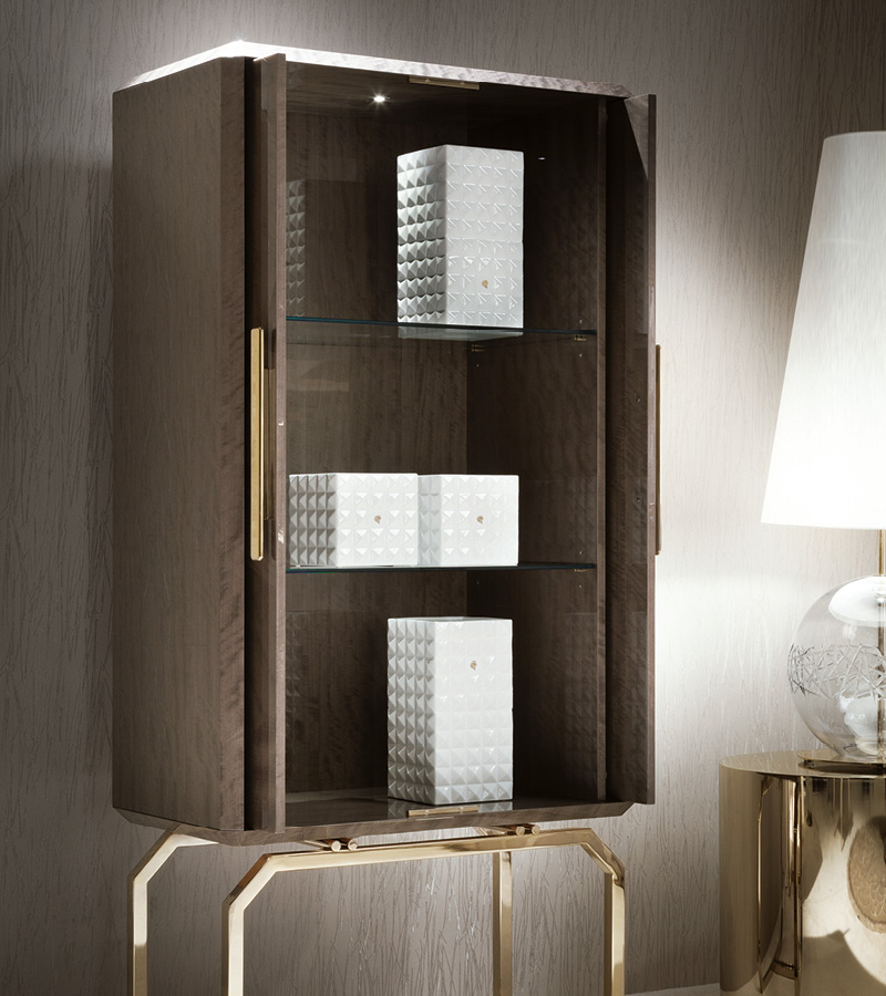 Vetrine with 2 inlaid wooden doors in makorè mahogany veneer with high gloss polyester finish. Base and handles in light gold chrome stainless steel with Giorgio Collection logo. 2 halogene led lights including switch. 2 inside adjustable glass shelves.