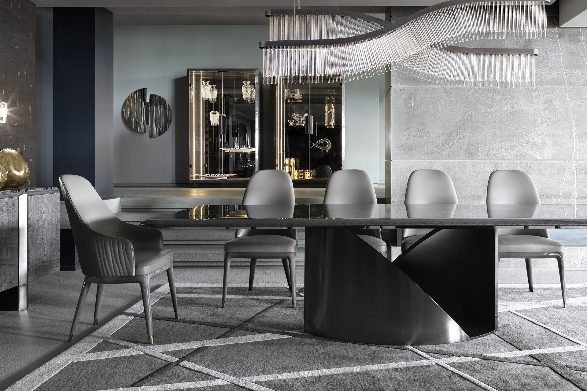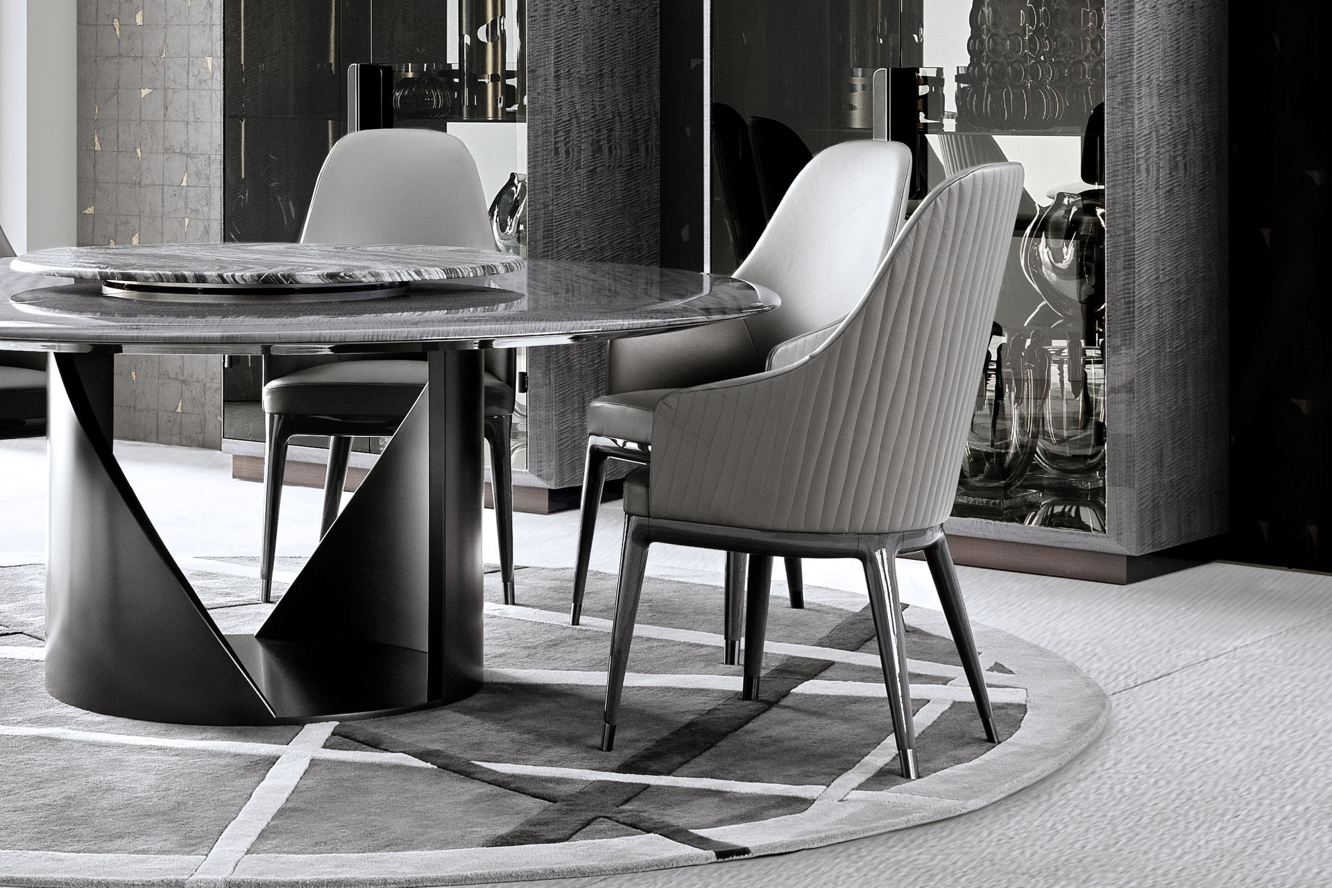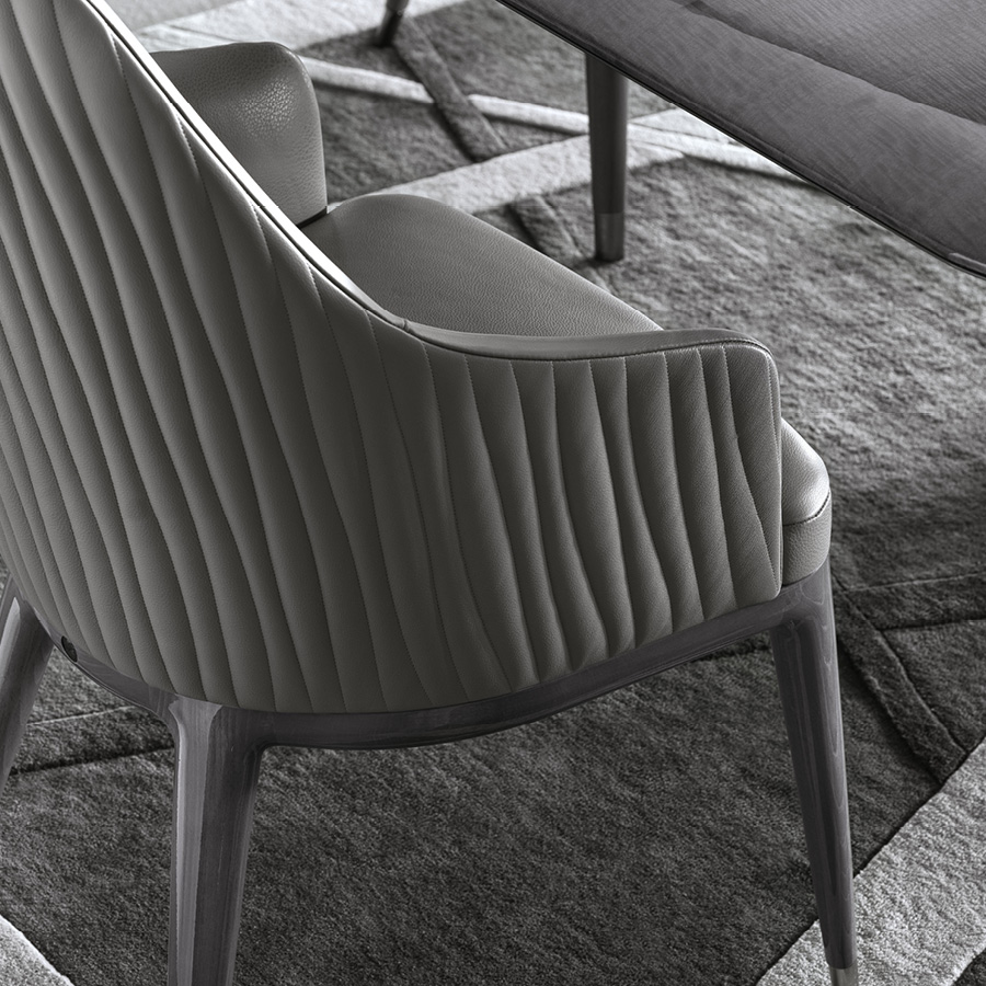 Fully upholstered arm chair in solid beech. Back in quilted first grade leather, nubuk leather, lizard printed leather, velvet or suede fabric. Wooden base with Giorgio Collection logo. 4 legs with details in satin black nickel stainless steel.