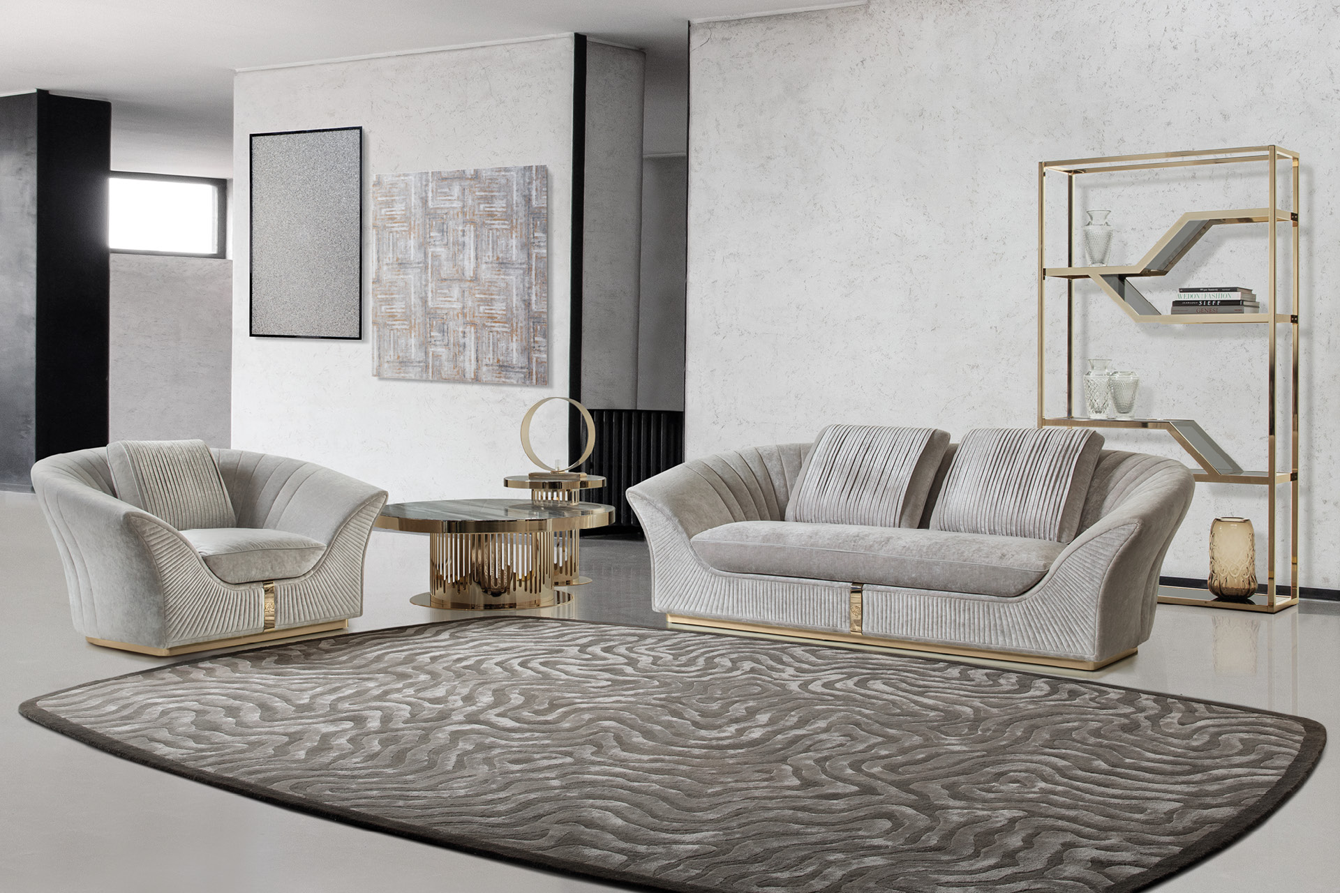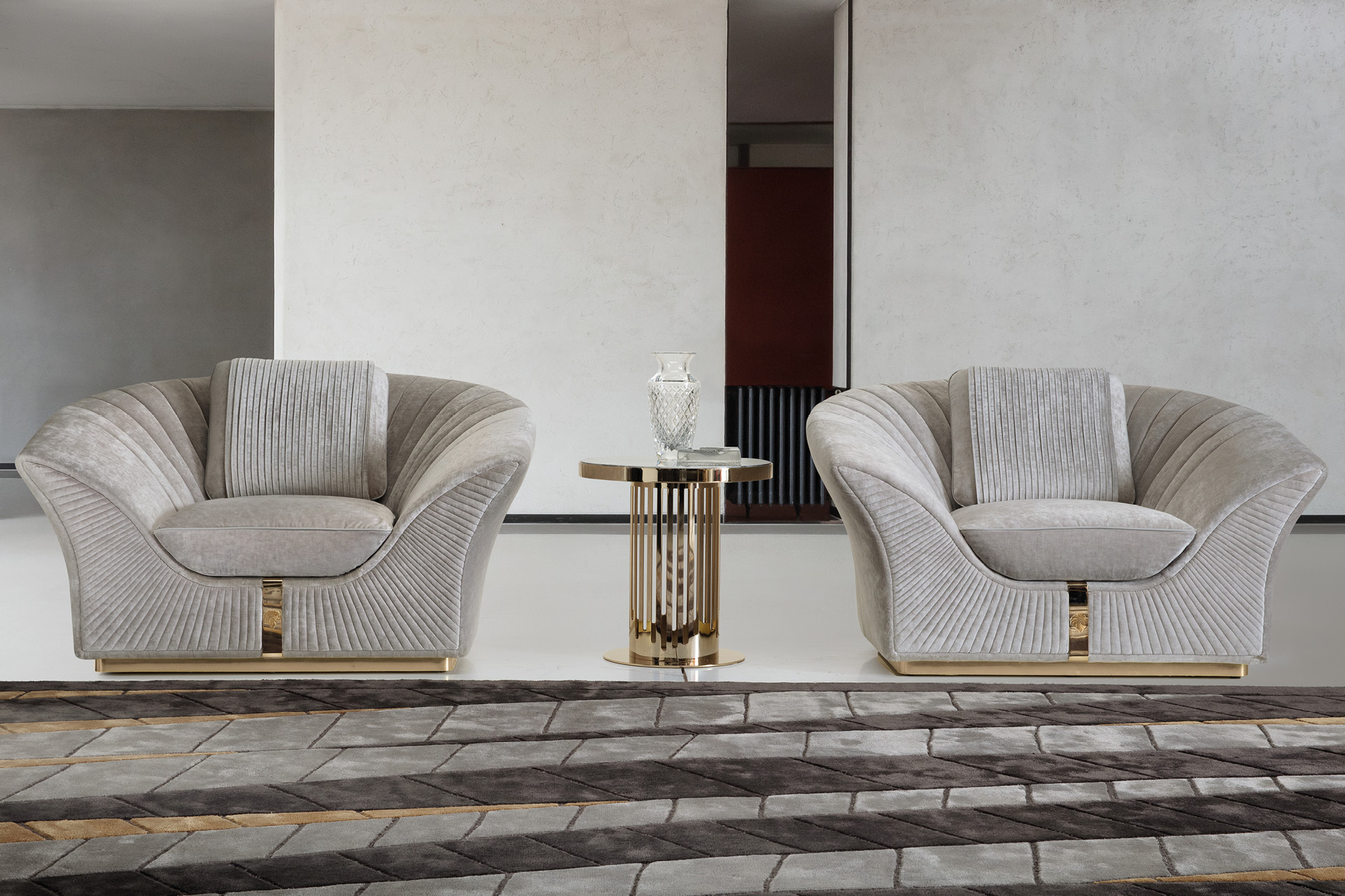 Sofa armchair with quilted fronts available in first grade leather, nubuk leather, lizard printed leather, velvet or suede fabric. Seat and sides in polyurethane foam wrapped in down feather. Pillow with leather trim. 1 big back pillow and base + frontal insert in light gold chrome stainless steel with Giorgio Collection logo.