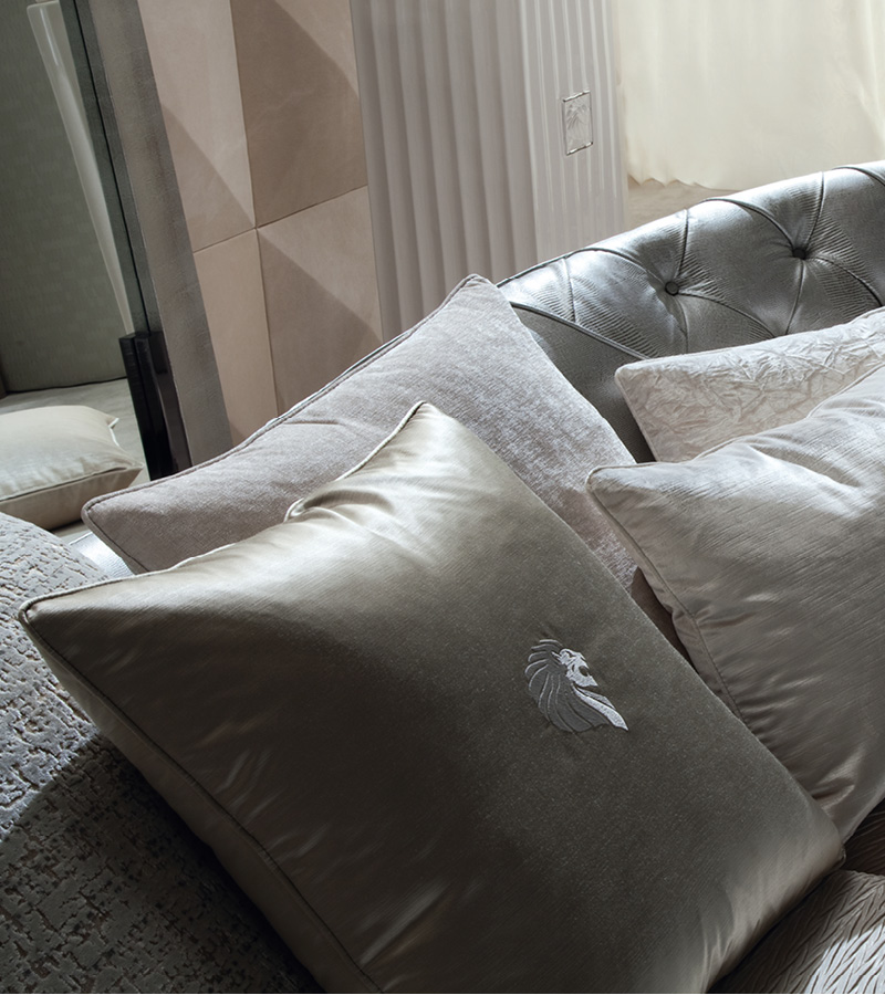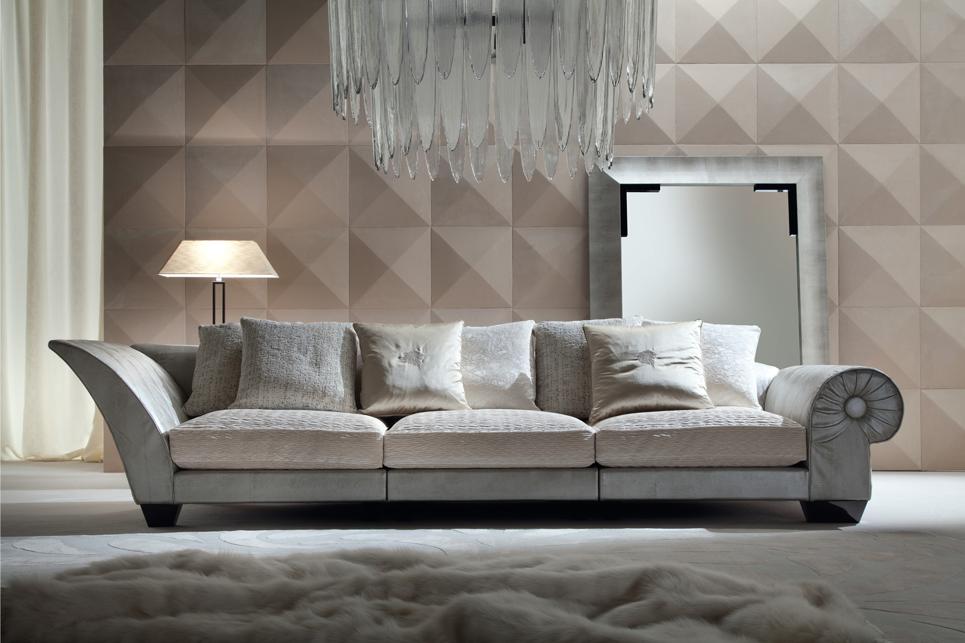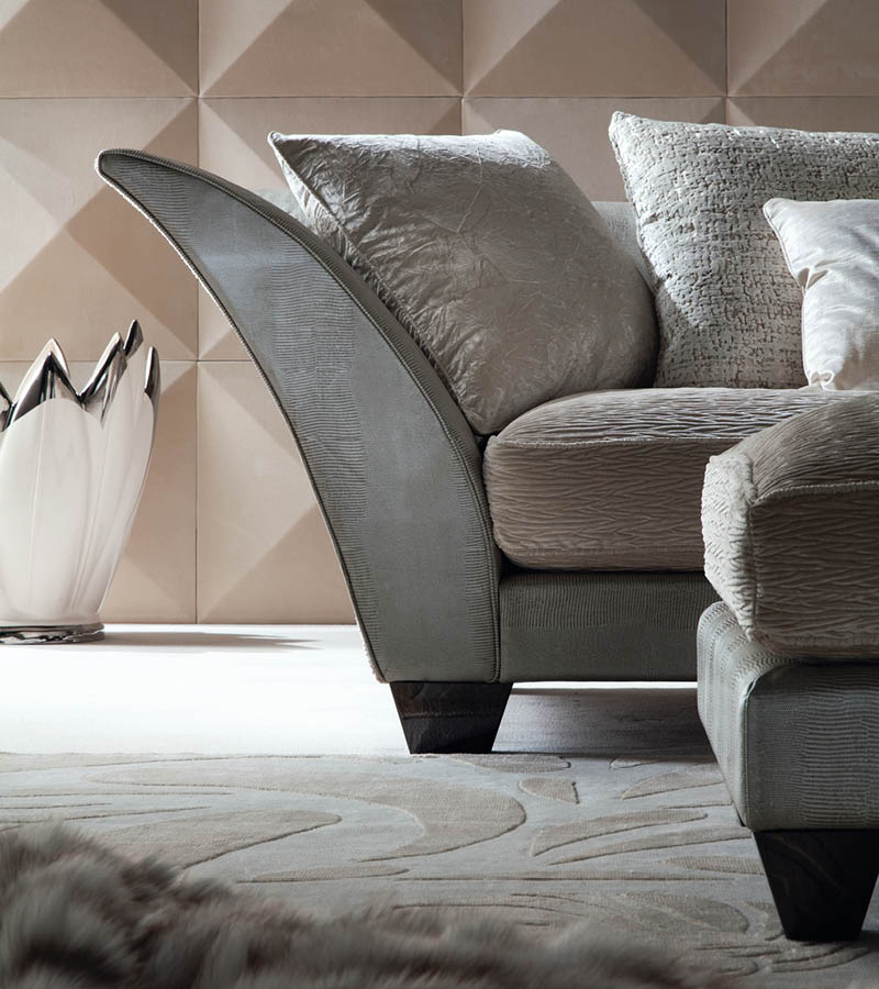Yoko sectional sofa available in first grade leather, nubuk leather, lizard printed leather, velvet or suede fabric. Seat in polyurethane foam wrapped in down feather. Feet in stainless steel in storm dark grey finish.
