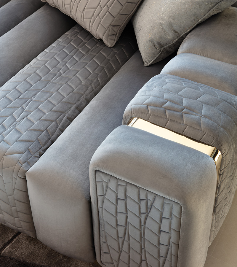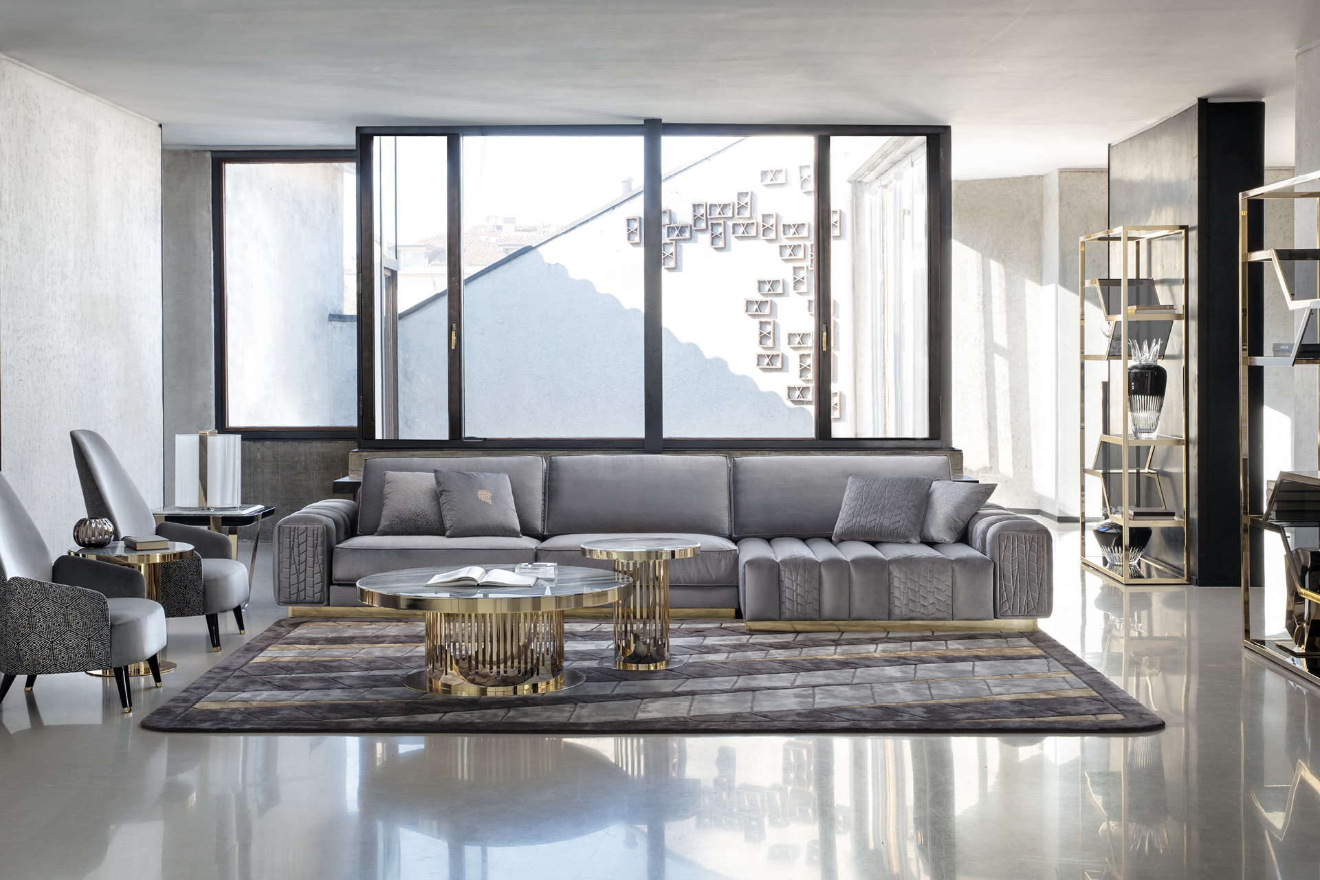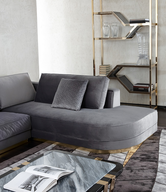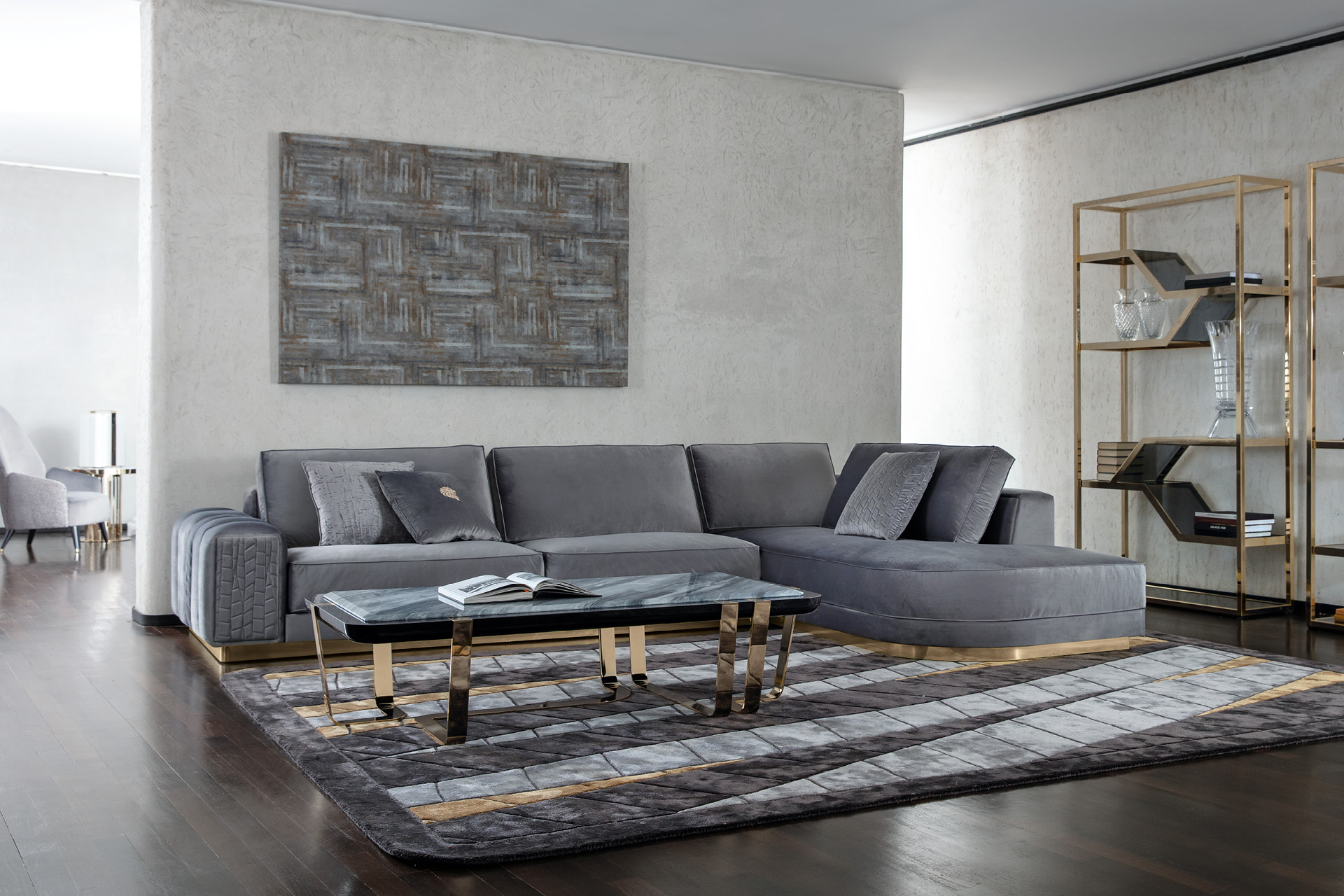 Charisma sectional sofa available in first grade leather, nubuk leather, lizard printed leather, velvet or suede fabric. Sofa seats and sides with double stitching in polyurethane foam wrapped in down feather. Base in light gold chrome stainless steel.