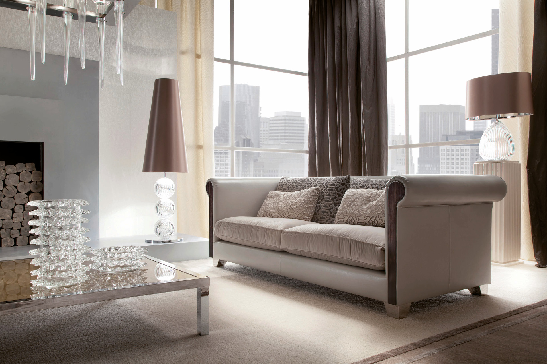 Fixed sofa seats in combination with lizard printed leather, and velvet with n. 2 big + 2 small pillows w/down fillings. Seats in polyurethane foam wrapped in down. 2 side fronts in makassar ebony veneer in satin finish. Chrome stainless steel feet. Leather needs: mt 18,0
