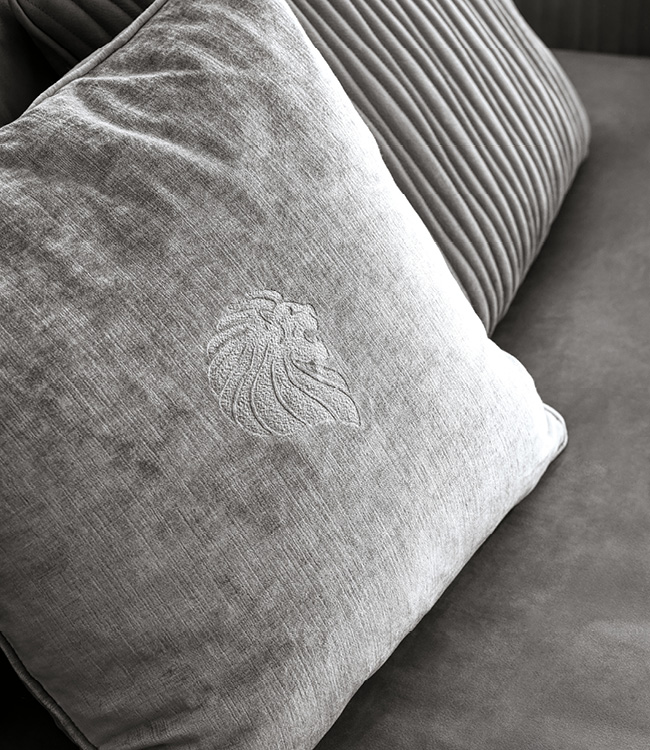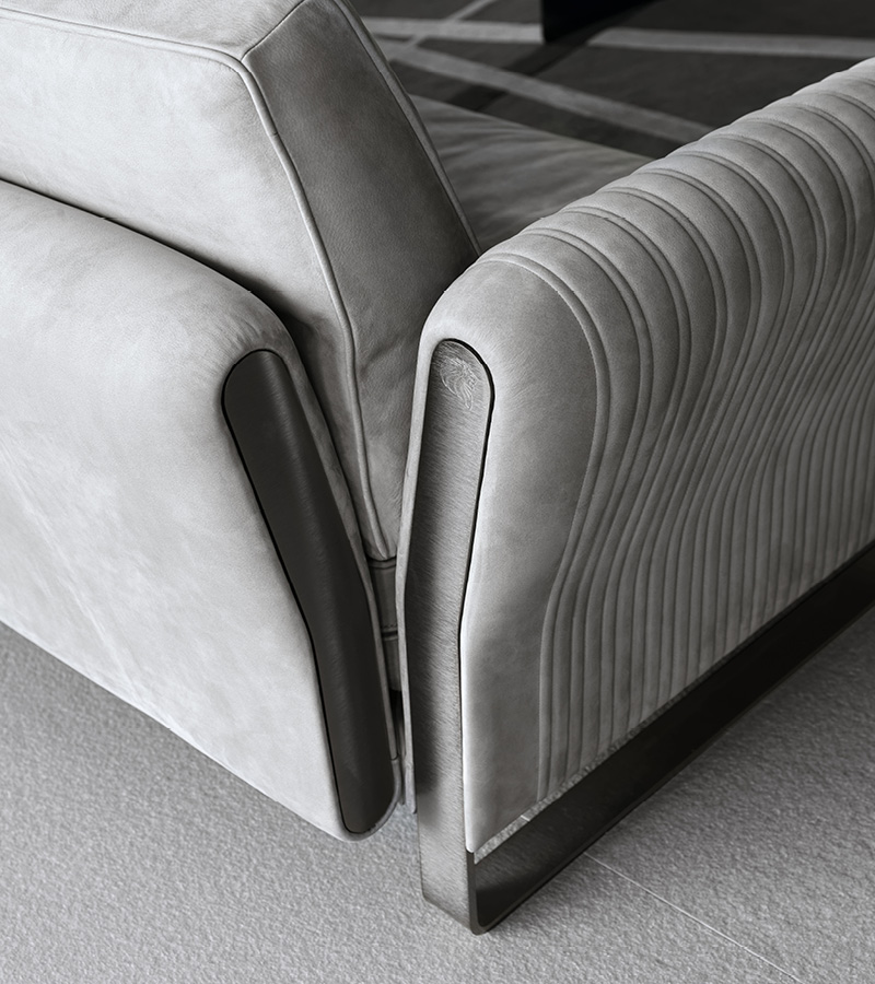 Sofa available in first grade leather, nubuk leather, lizard printed leather, velvet or suede fabric. Sofa seats and sides with special stitching in polyurethane foam wrapped in down feather. High armrests. Legs and metal trims on the armrests in satin black nickel stainless steel with lasered Giorgio Collection logo.