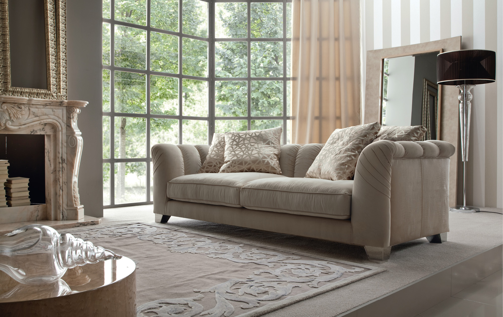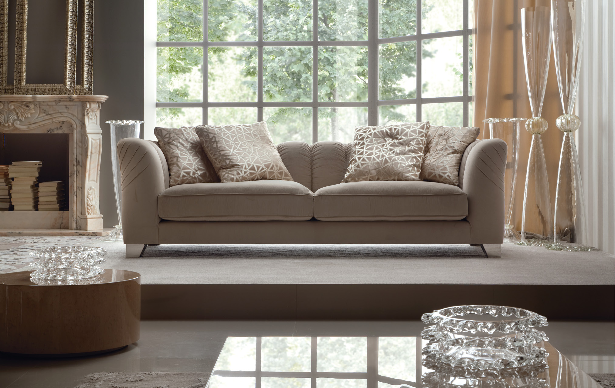 Fixed sofa with 4 big pillows. Chrome stainless steel feet.