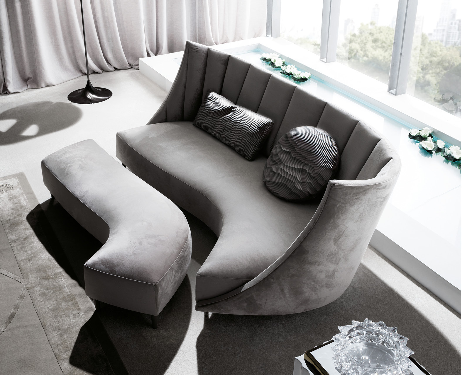 Sofa 3 seats available in first grade leather, nubuk leather, lizard printed leather,velvet or suede fabric. Seat in polyurethane foam wrapped in down feather, 3 back pillows 100% down filling. Black nickel steel feet. Available left facing or right facing.