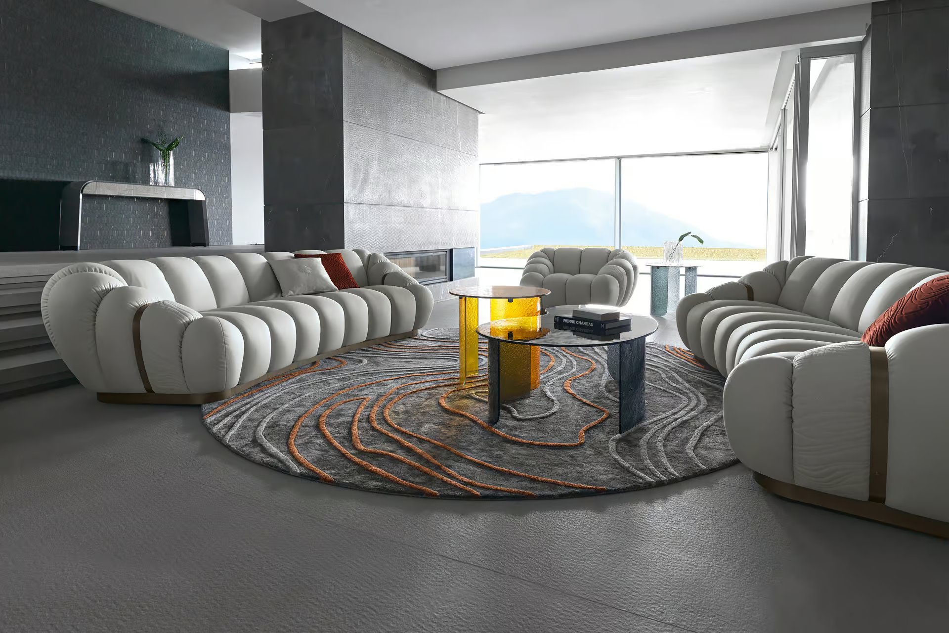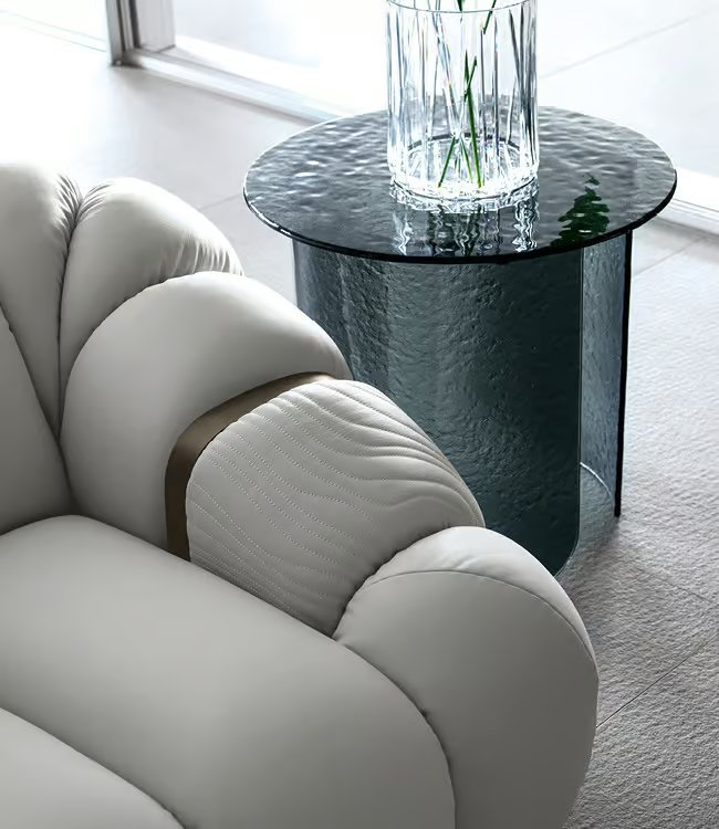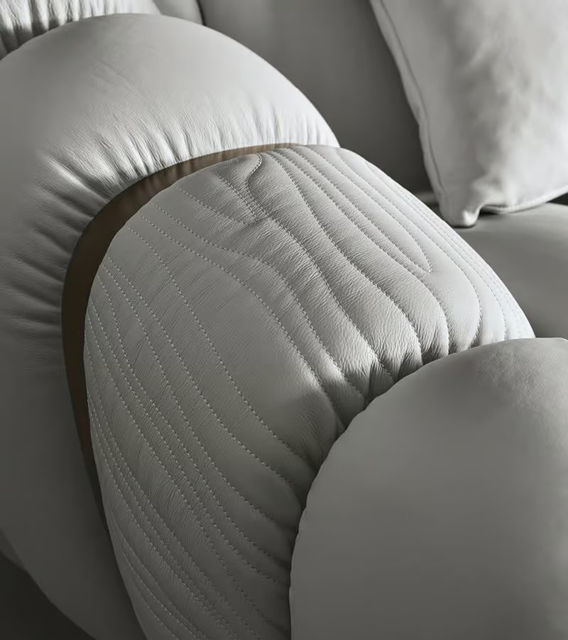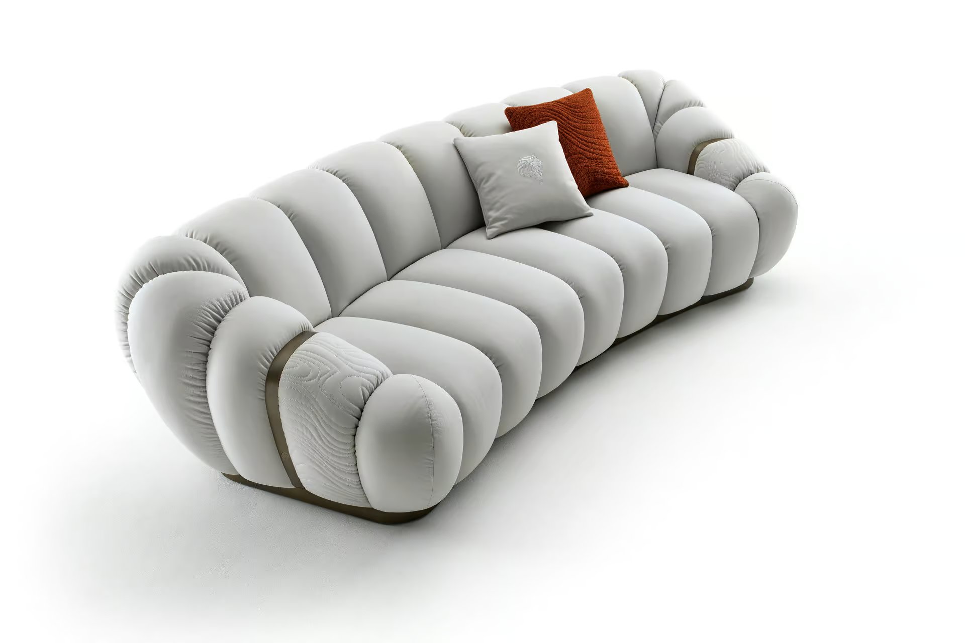 Curved sofa available in first grade leather, nubuk leather, lizard printed leather, velvet or suede fabric. Sofa seats and sides with special stitching in polyurethane foam wrapped in down feather. Quilted armrests. Base and metal trims on the armrests in satined bronzed stainless steel with Giorgio Collection logo. Seat height cm. 42