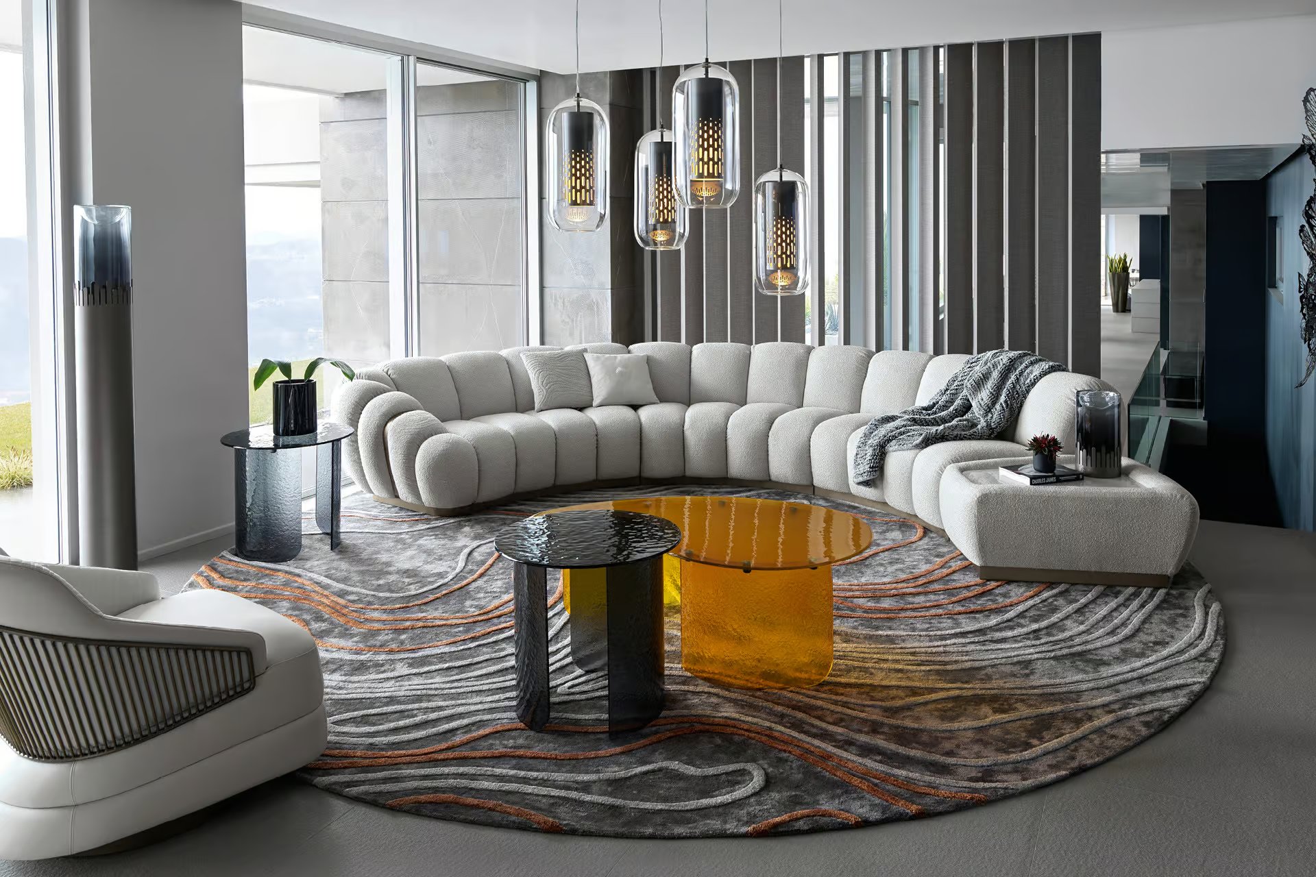 Modular sofa available in first grade leather, nubuk leather, lizard printed leather, velvet or suede fabric. Sofa seats and sides with special stitching in polyurethane foam wrapped in down feather. Quilted armrests. Base and metal trims on the armrests in satined bronzed stainless steel with Giorgio Collection logo. Seat height cm. 42