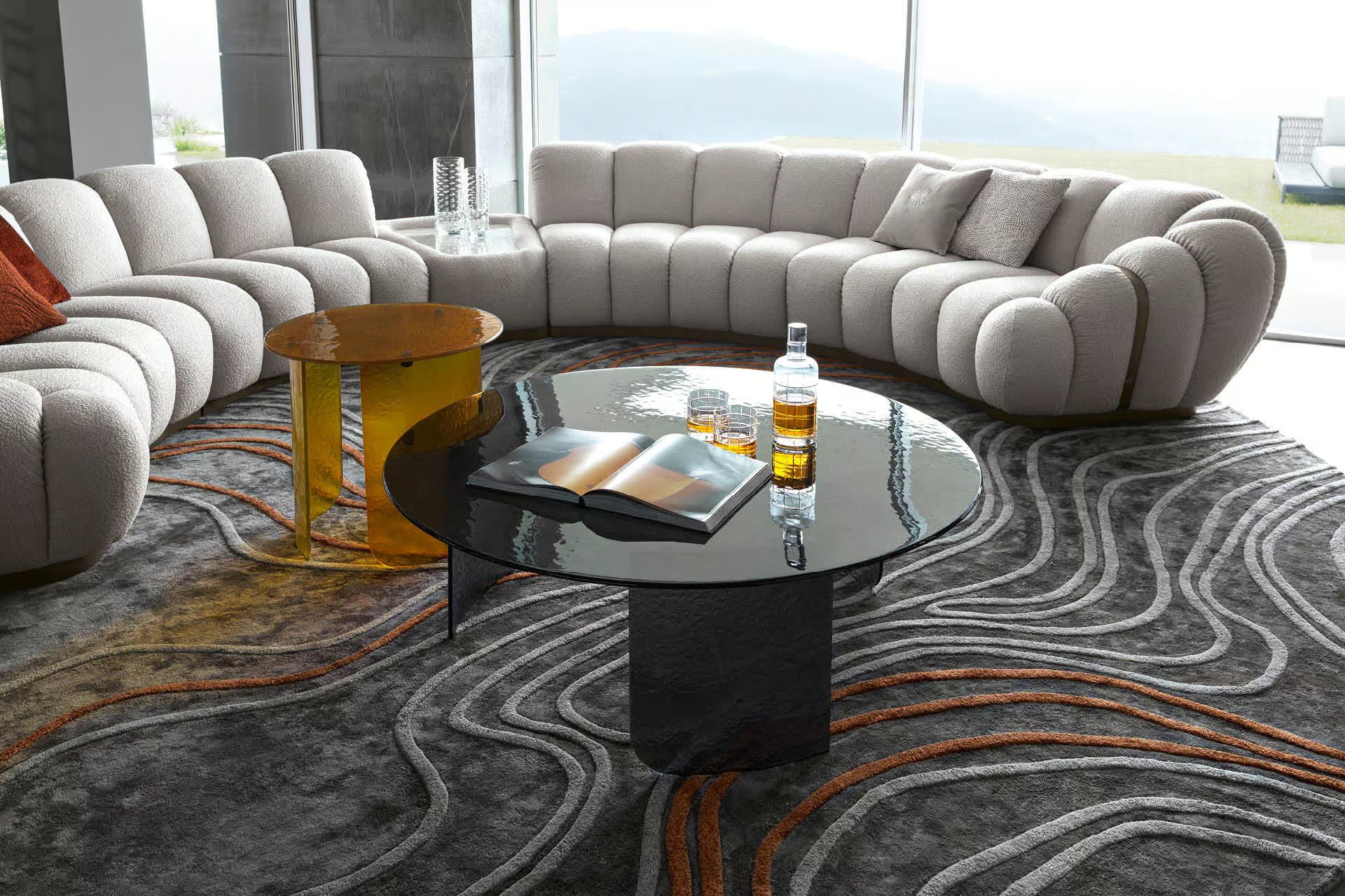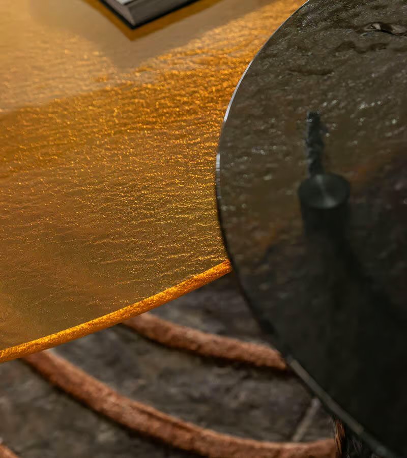 Round cocktail table with top and base available in brown, smoke or amber hand hammered fused glass.