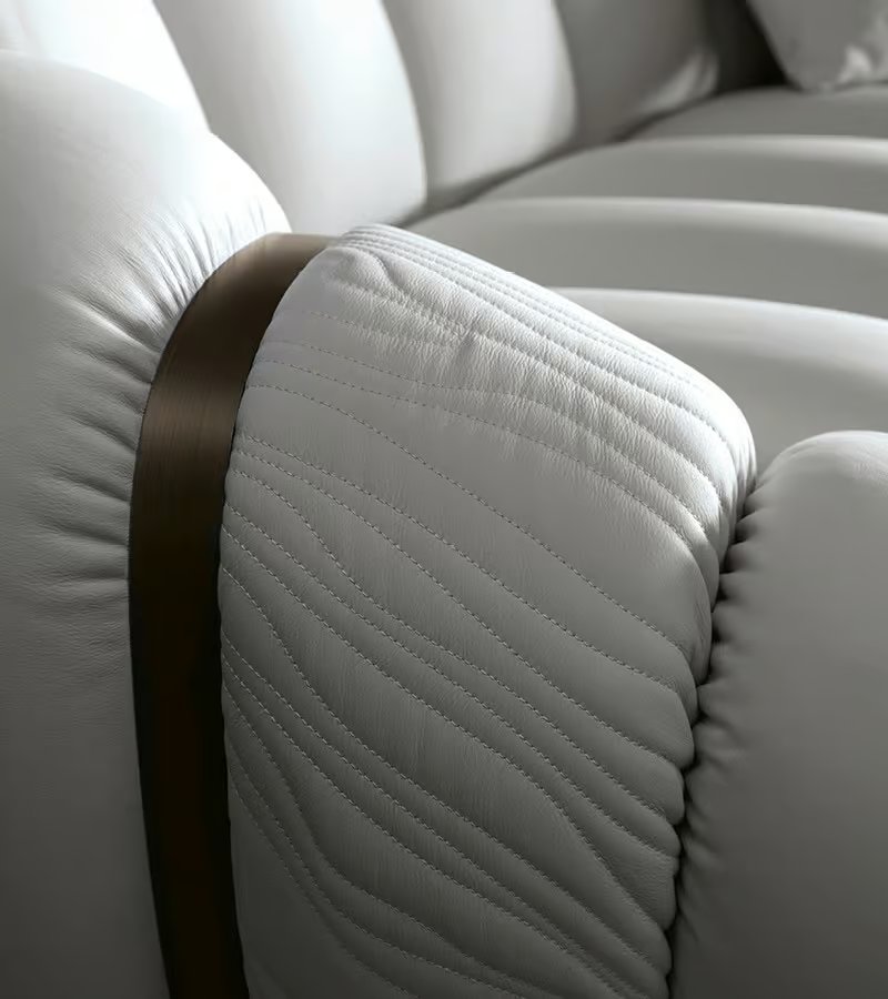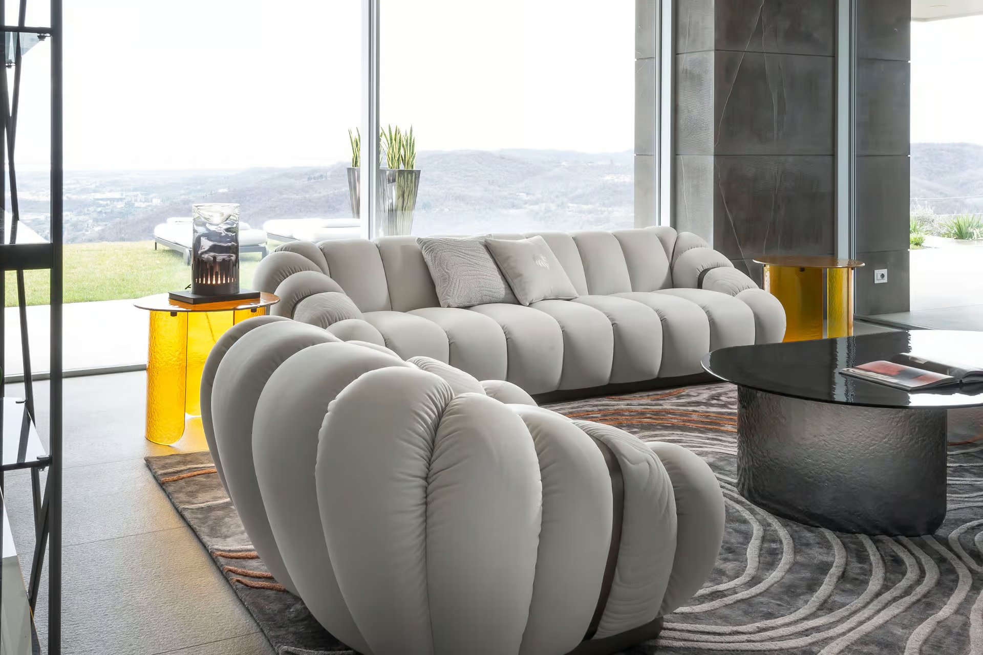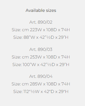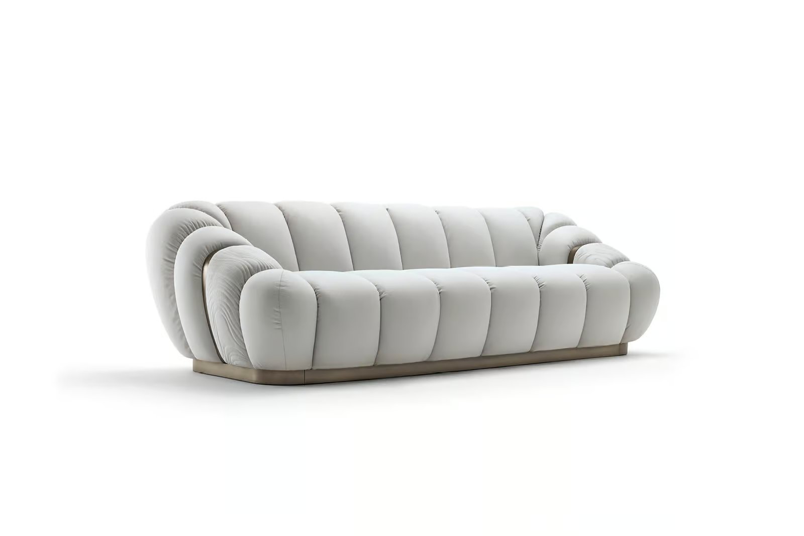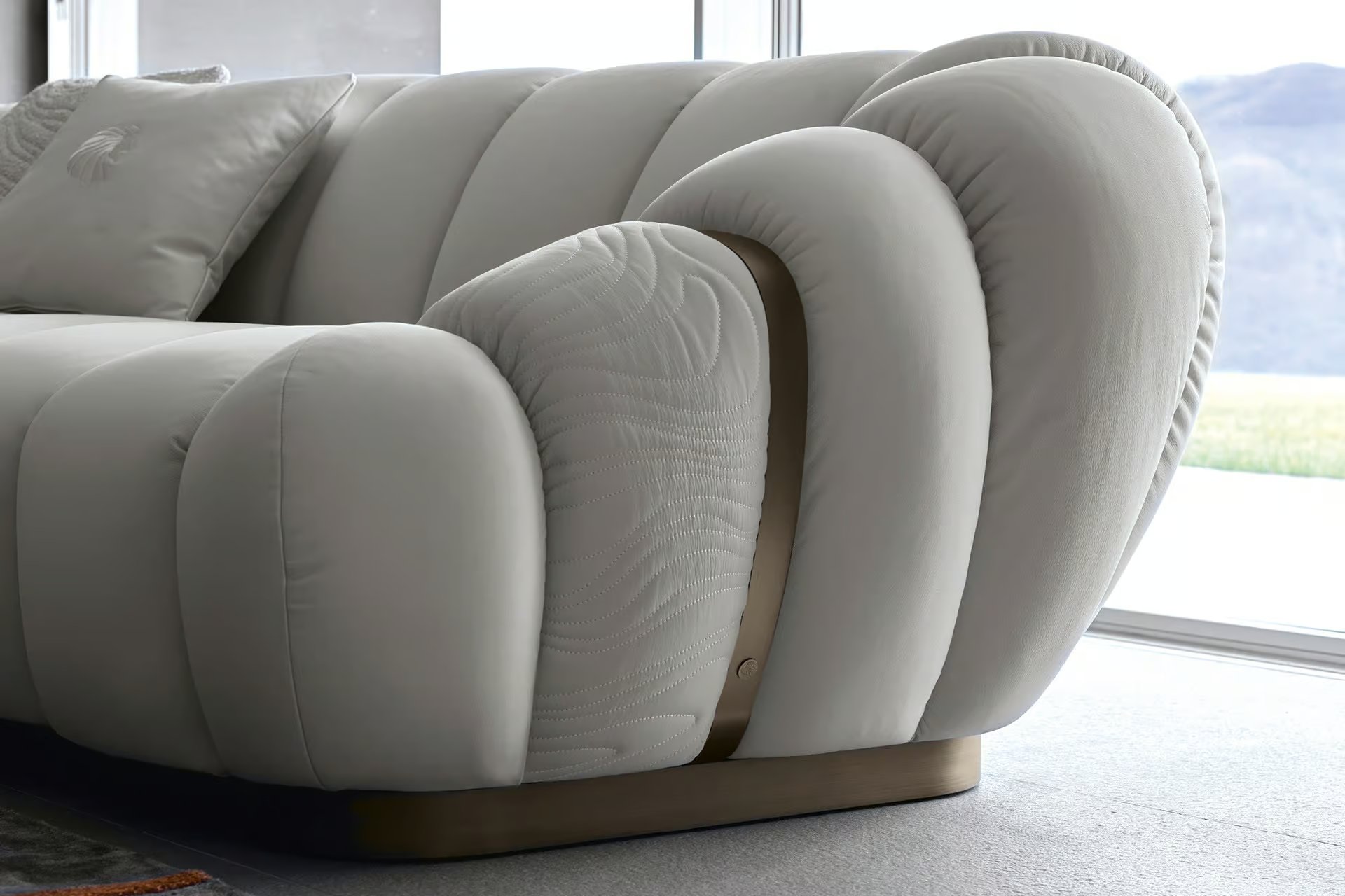 Sofa available in first grade leather, nubuk leather, lizard printed leather, velvet or suede fabric. Sofa seats and sides with special stitching in polyurethane foam wrapped in down feather. Quilted armrests. Base and metal trims on the armrests in satined bronzed stainless steel with Giorgio Collection logo. Seat height cm. 42