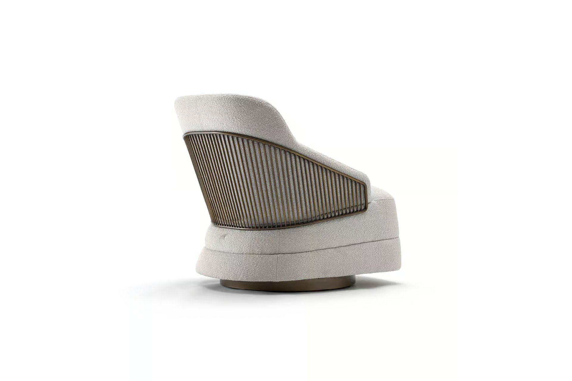 Occasional swivel chair available in first grade leather, nubuk leather, lizard printed leather, velvet or suede fabric. Chair seat and sides with double stitching in polyurethane foam wrapped in down feather. Quilted back with satined bronzed stainless steel structure. Seat height cm. 39.