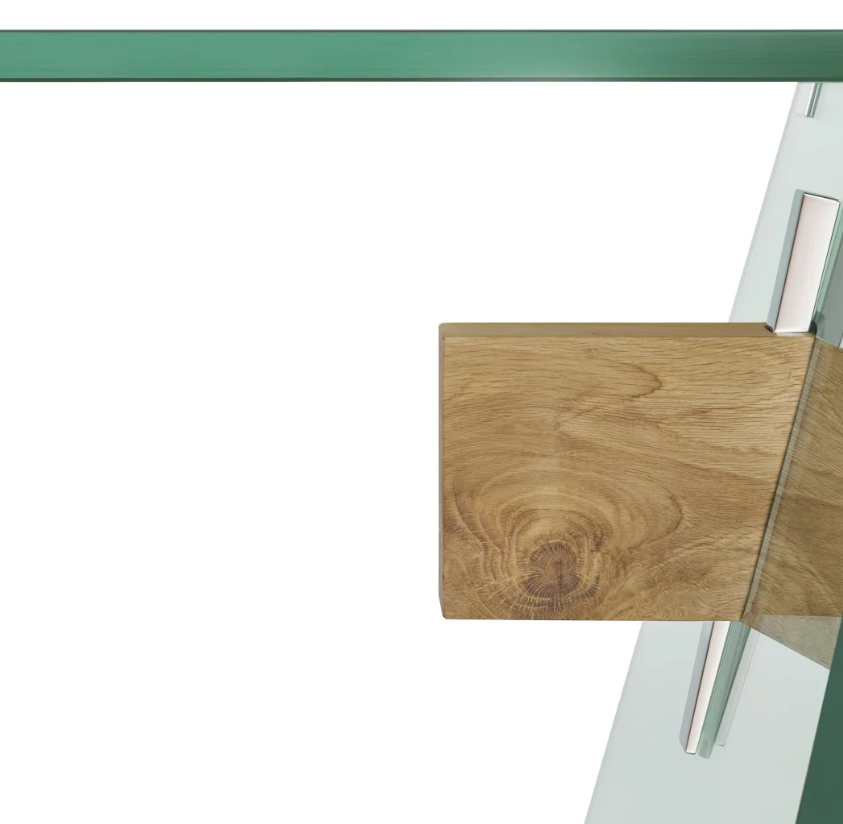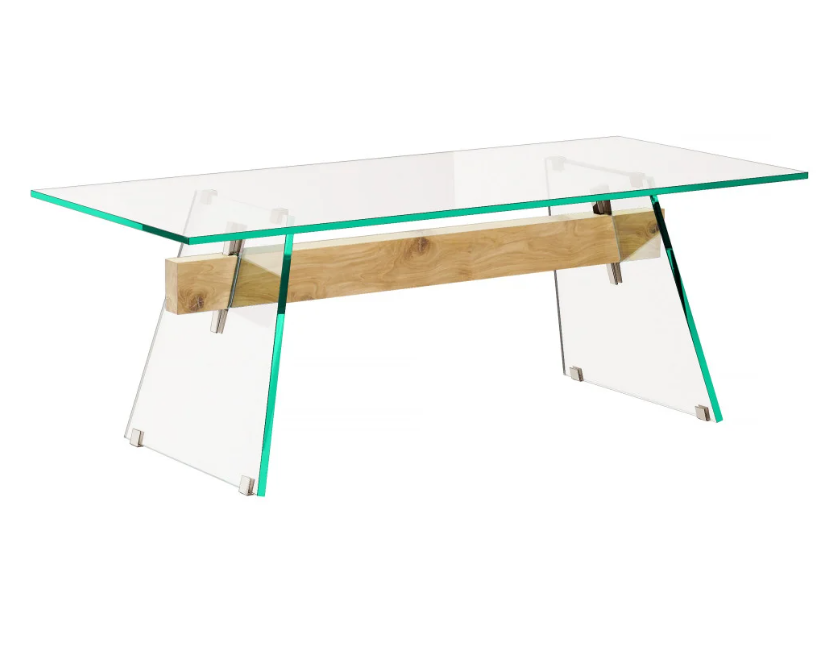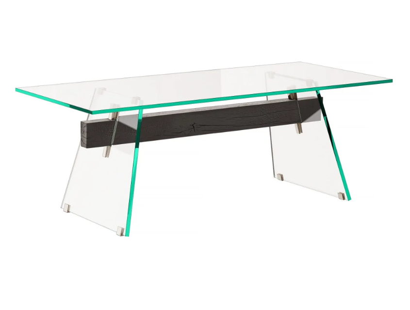 Serie di tavoli da pranzo rettangolari con piano in cristallo trasparente mm 19 e base in cristallo trasparente mm 24 temperato. Una trave, in un unico massello di grosso spessore, passa attraverso i fori - a filo lucido inclinato - dei cristalli della base, unendoli e sostenendoli. Dei cunei in metallo cromato lucido si inseriscono ad incastro nei fori rastremati presenti sulla trave in legno, bloccando saldamente le lastre di cristallo della base e conferendo alla stessa massima stabilità e solidità. La trave, in massello di rovere, è disponibile in due finiture naturali: con spazzolatura profonda e finita a cera, oppure carbonizzata per mezzo di un trattamento termico. I piedini e i supporti delle basi e del piano sono in metallo cromato lucido.