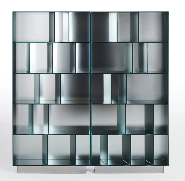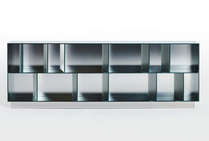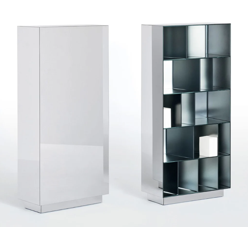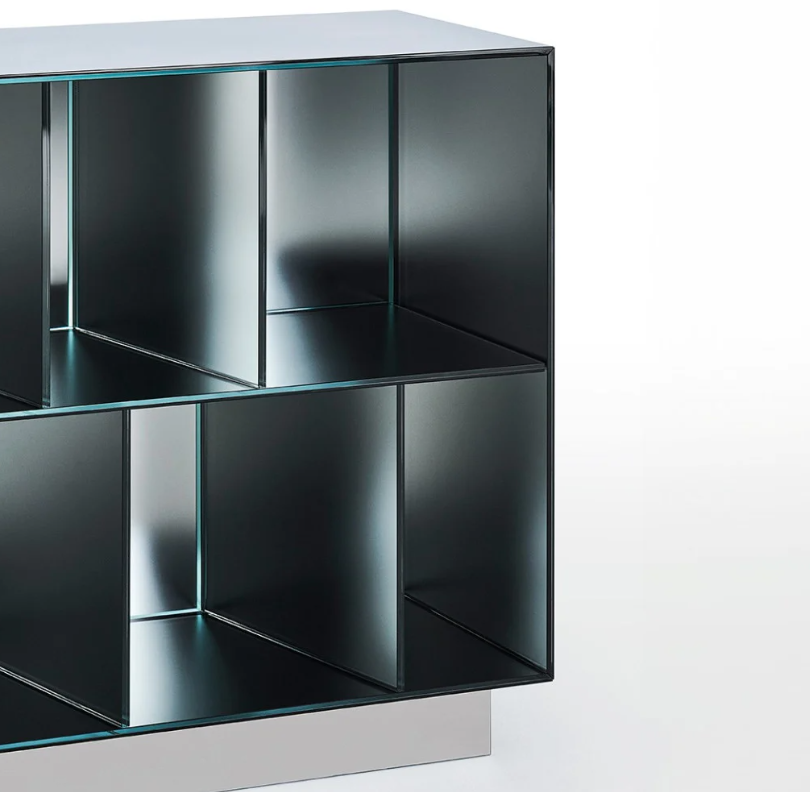 Serie di mobili contenitori a giorno in cristallo stratificato 5+5 mm, molato filo lucido e termosaldato a 45°. La superficie esterna presenta una speciale finitura a specchio, mentre la superficie interna è in specchio opacizzato, che riflette le immagini in maniera sfuocata ed indefinita.
