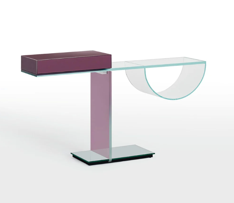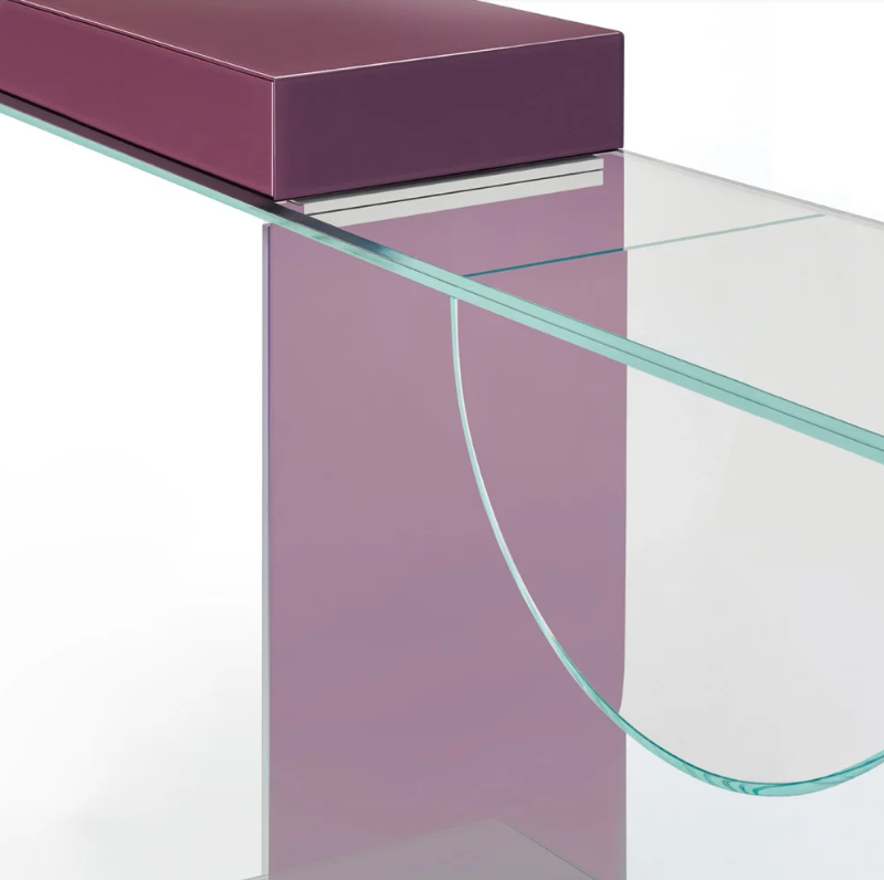 Consolle dalle raffinate ed innovative soluzioni tecniche ed estetico-decorative. Sulla superficie inferiore del top, in cristallo extrachiaro stratificato 10+10 mm, è incollato a UV un cristallo extrachiaro curvo con funzione porta oggetti, mentre sulla superficie superiore è fissato un cassetto con apertura push-pull, rivestito in cristallo laccato lucido. La piantana verticale è in cristallo temperato stratificato 12+12 mm con finitura trasparente extralight o nella gamma dei Cristalli Trasparenti Colorati. Top e piantana sono assemblati e smontabili tramite una coppia di piastre metalliche lucidate a specchio. La base, fornita di piedini regolabili e fissata alla piantana verticale in maniera removibile, è rivestita in specchio mm.10. Il cassetto può essere montato con apertura sul fronte o sul retro.