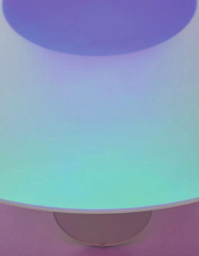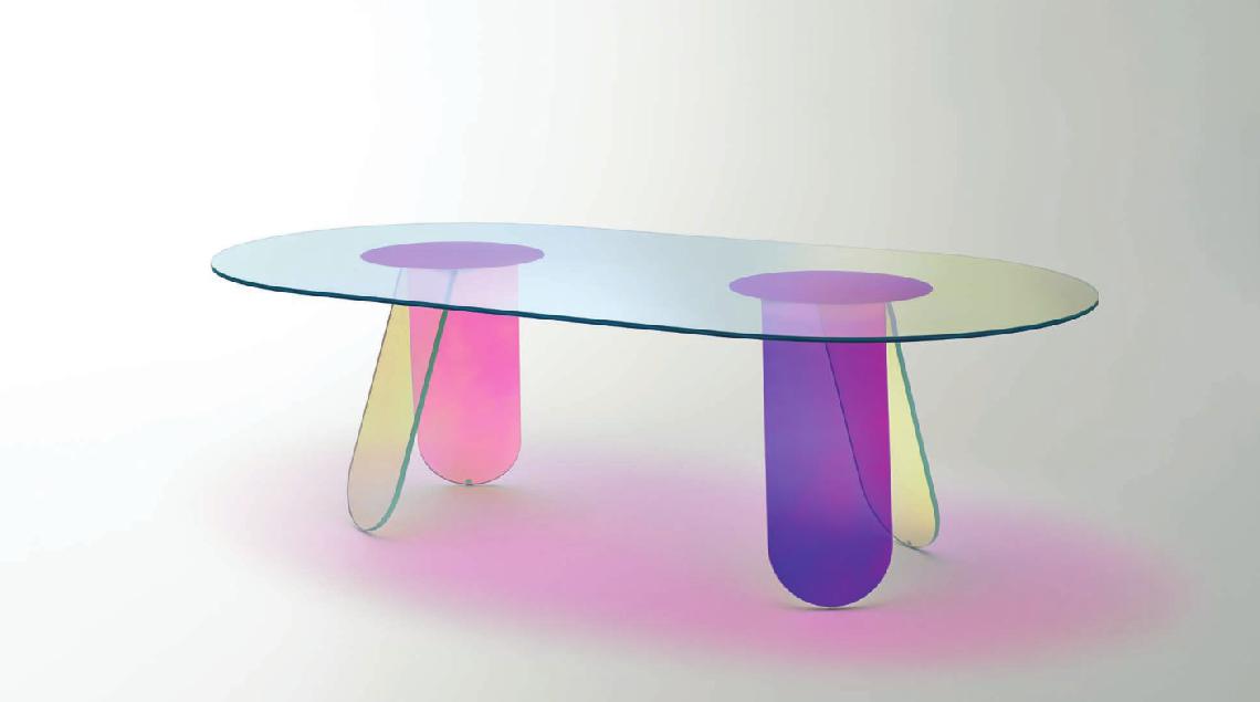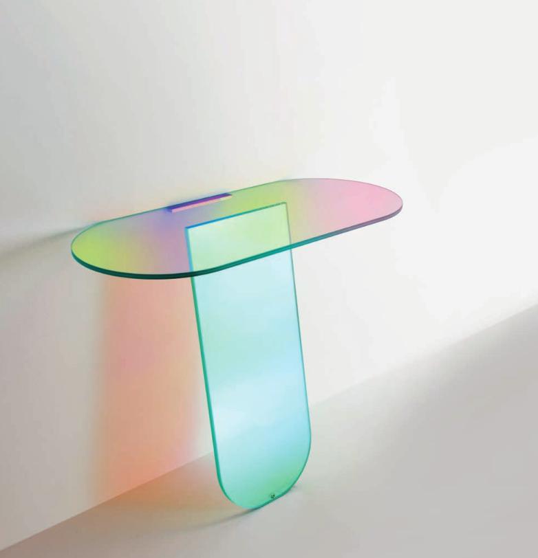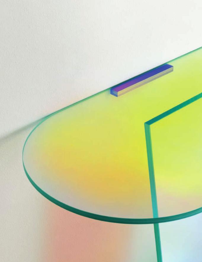 Tavoli alti, bassi e consolle in cristallo stratificato e incollato, con una speciale finitura multicromatica cangiante, la cui colorazione varia in funzione dell’angolo di incidenza della luce e del punto di osservazione. Ne risultano oggetti dall’aspetto magico ed etereo. Nei tavoli alti le basi sono smontabili e vengono fissate ai piani tramite piastre metalliche, dissimulate da decori circolari con finitura coprente.
