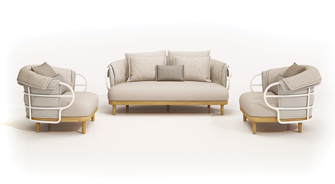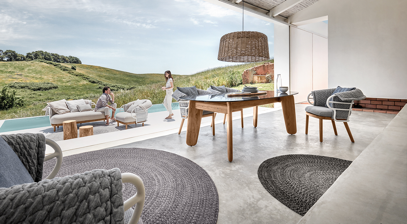 Like the shifting sands of the desert, the Dune collection combines soft lines and repeating patterns in an outdoor seating and dining concept using a collection of knitted fabrics designed by Sebastian Herkner. A bohemian influence defines the style, with softness and spontaneity added via specially developed fabrics made with 3D knitting technology