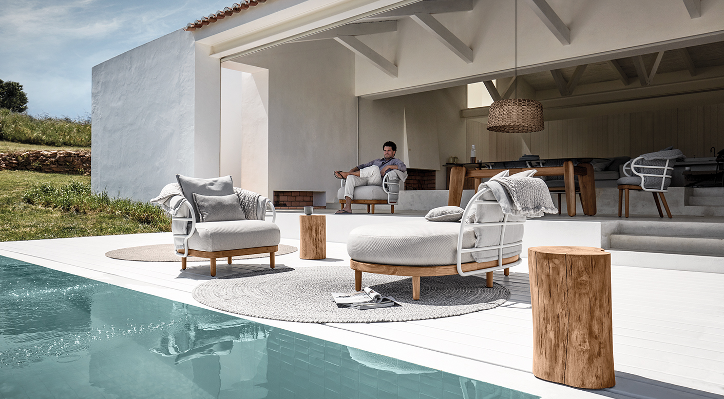 Like the shifting sands of the desert, the Dune collection combines soft lines and repeating patterns in an outdoor seating and dining concept using a collection of knitted fabrics designed by Sebastian Herkner. A bohemian influence defines the style, with softness and spontaneity added via specially developed fabrics made with 3D knitting technology