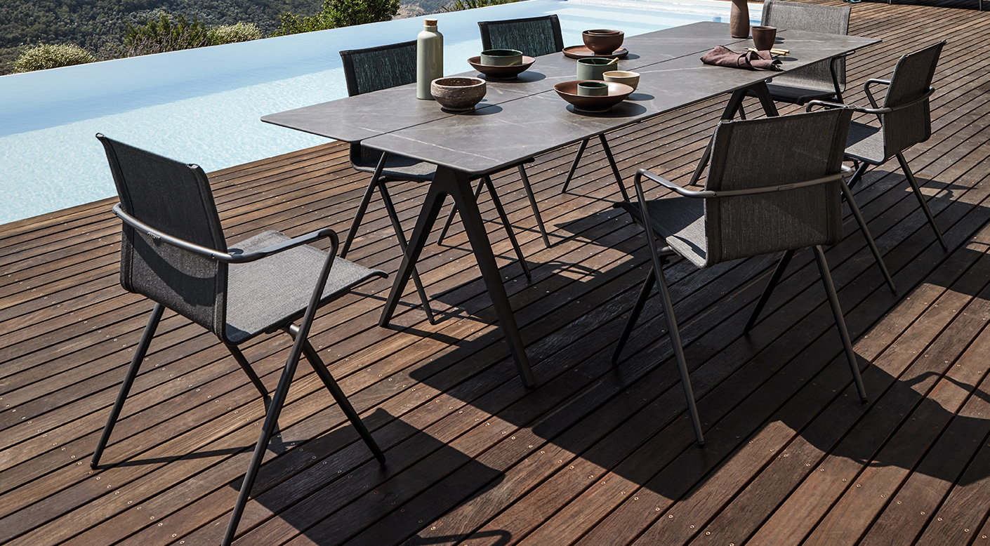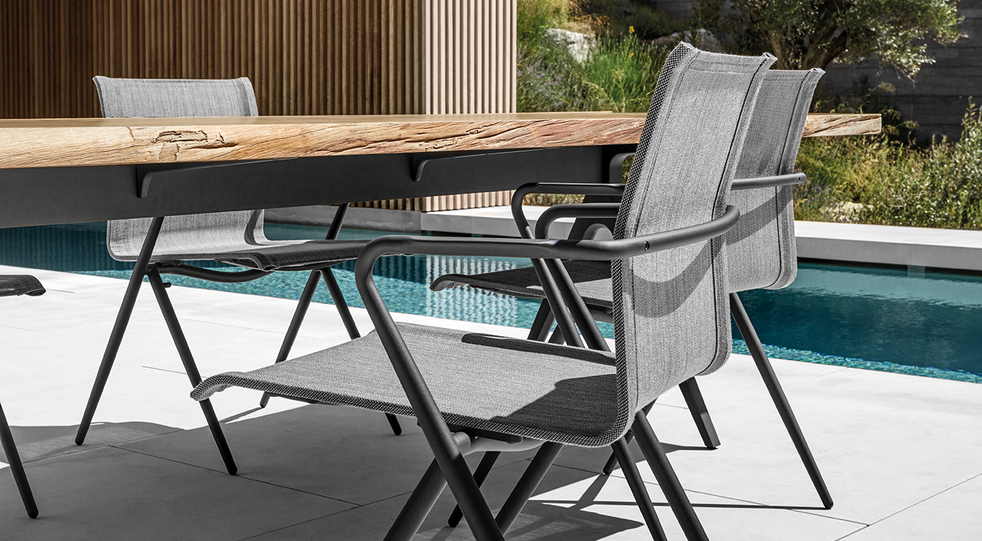Perfectly poised, Ryder's slim, powder coated, stainless steel frame boasts a toughness belied by its fine lines. The converging lines of this stainless steel stacking frame are inspired by more traditional folding designs. But in a unique twist, removing the mechanism creates an unprecedented minimalism. Finely balanced on scissor like legs this architectural piece is purely aesthetics driven.