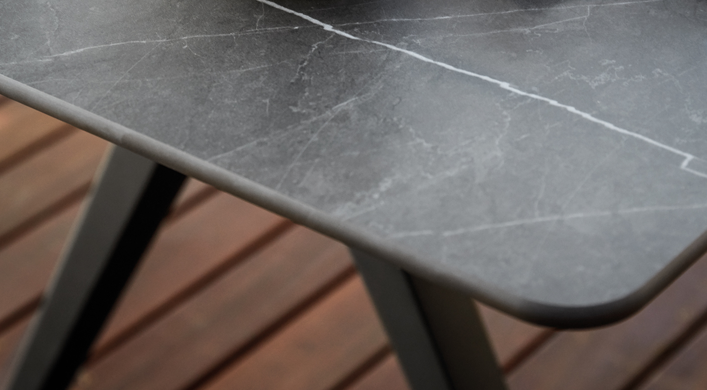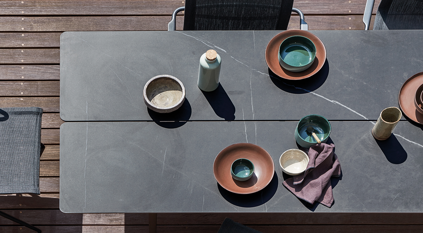 Split tables strike a bold pose. With powder coated, cast aluminium legs formed in a characteristic inverted Y, their tapering form emphasises a light and subtle connection to the ground while supporting either plantation teak or solid ceramic tops of various lengths.