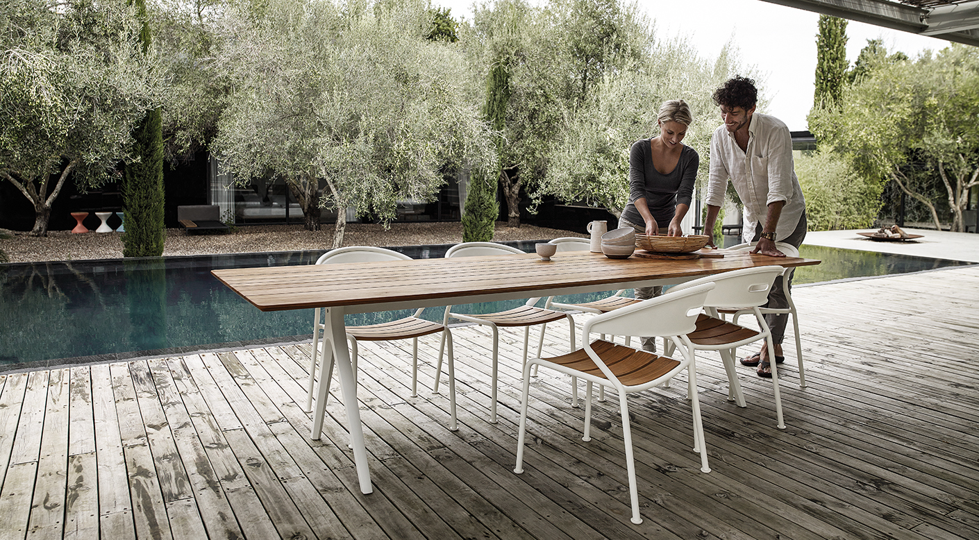 Split tables strike a bold pose. With powder coated, cast aluminium legs formed in a characteristic inverted Y, their tapering form emphasises a light and subtle connection to the ground while supporting either plantation teak or solid ceramic tops of various lengths.