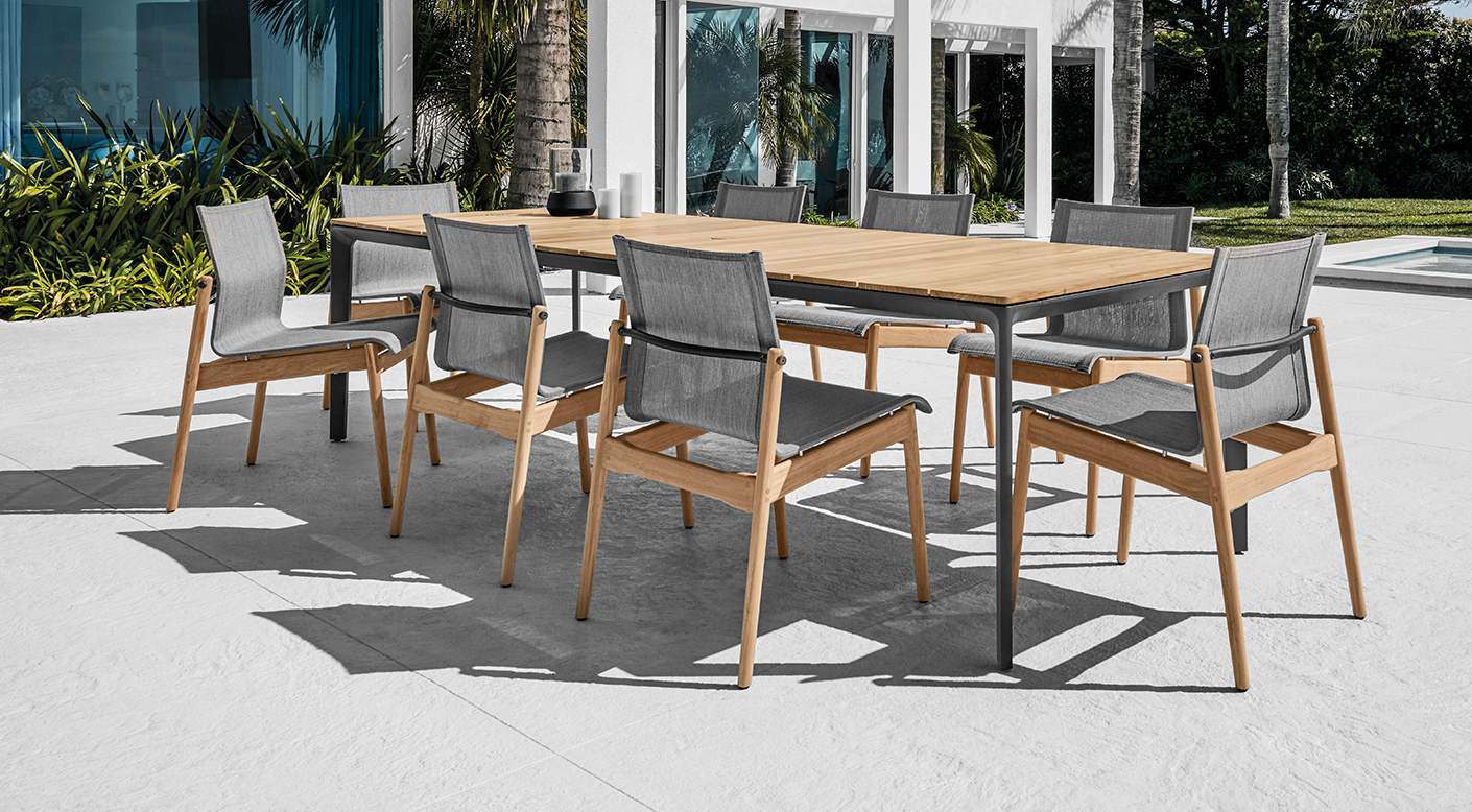 In outdoor situations we often spend more time relaxing and lounging, and when dining we tend to take our time. So why not make the situation as comfortable as possible? With Sway, Danish designer Henrik Pedersen has combined a finely proportioned teak frame with a practical sling seat and back to deliver inherent sprung comfort despite an extremely minimal profile.