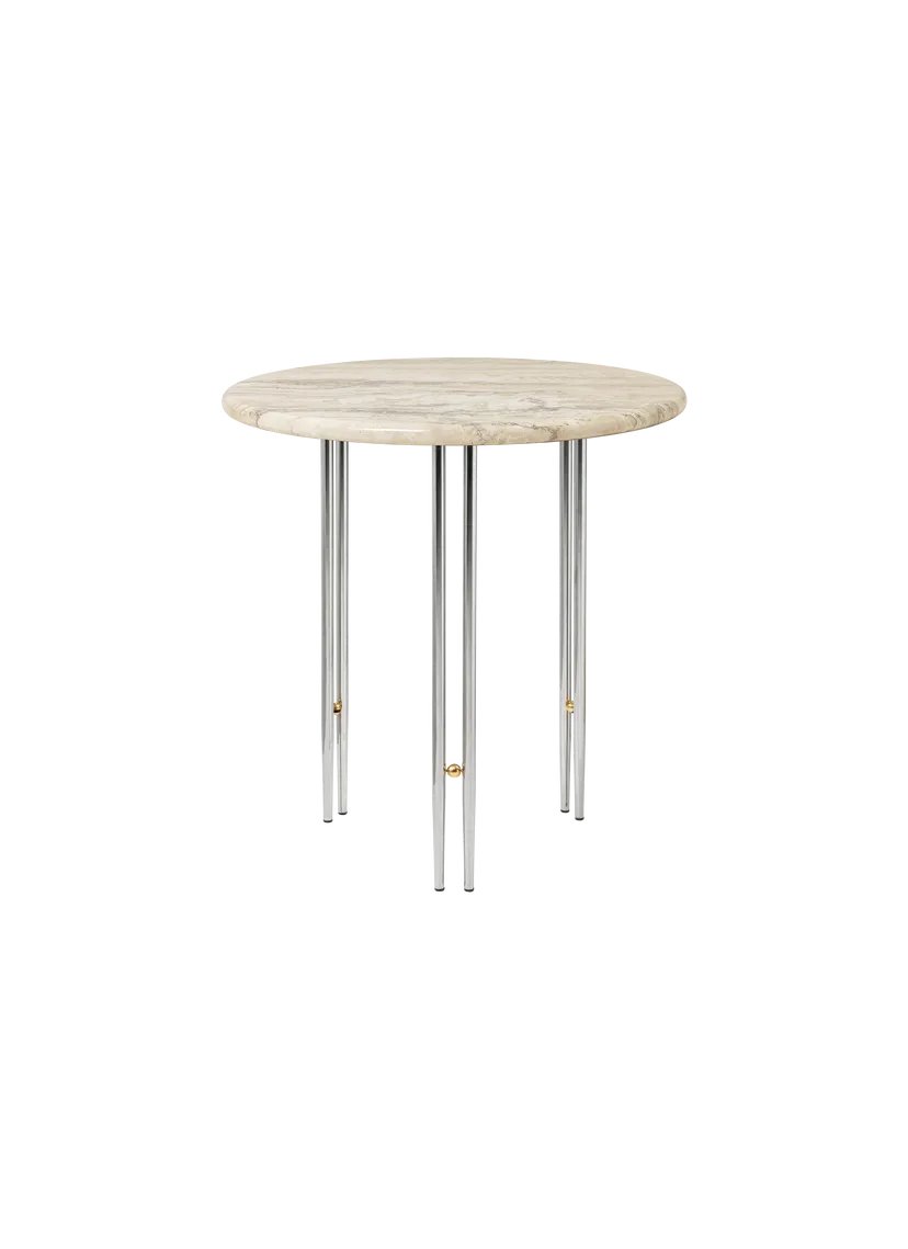 The IOI Side Table by GamFratesi is a celebration of Italian materiality, featuring solid brass, steel, and now travertine. Drawing on geometric Art Deco references with a contemporary design language, the collection explores the empty space between the physical form as much as the form itself. Striking and unique, the IOI Collection takes its name from the structure of the table legs, each of which is formed from twin metal tubes linked by a sphere of brass the letters I-O-I rendered in physical form. Retaining this slender base, in black or chrome options, GUBI’s new edition introduces a new material and color to the circular tabletop travertine in Rippled Beige and refines its shape. The sides are rounded to create a U-shaped edge that arcs evenly on the top and bottom.